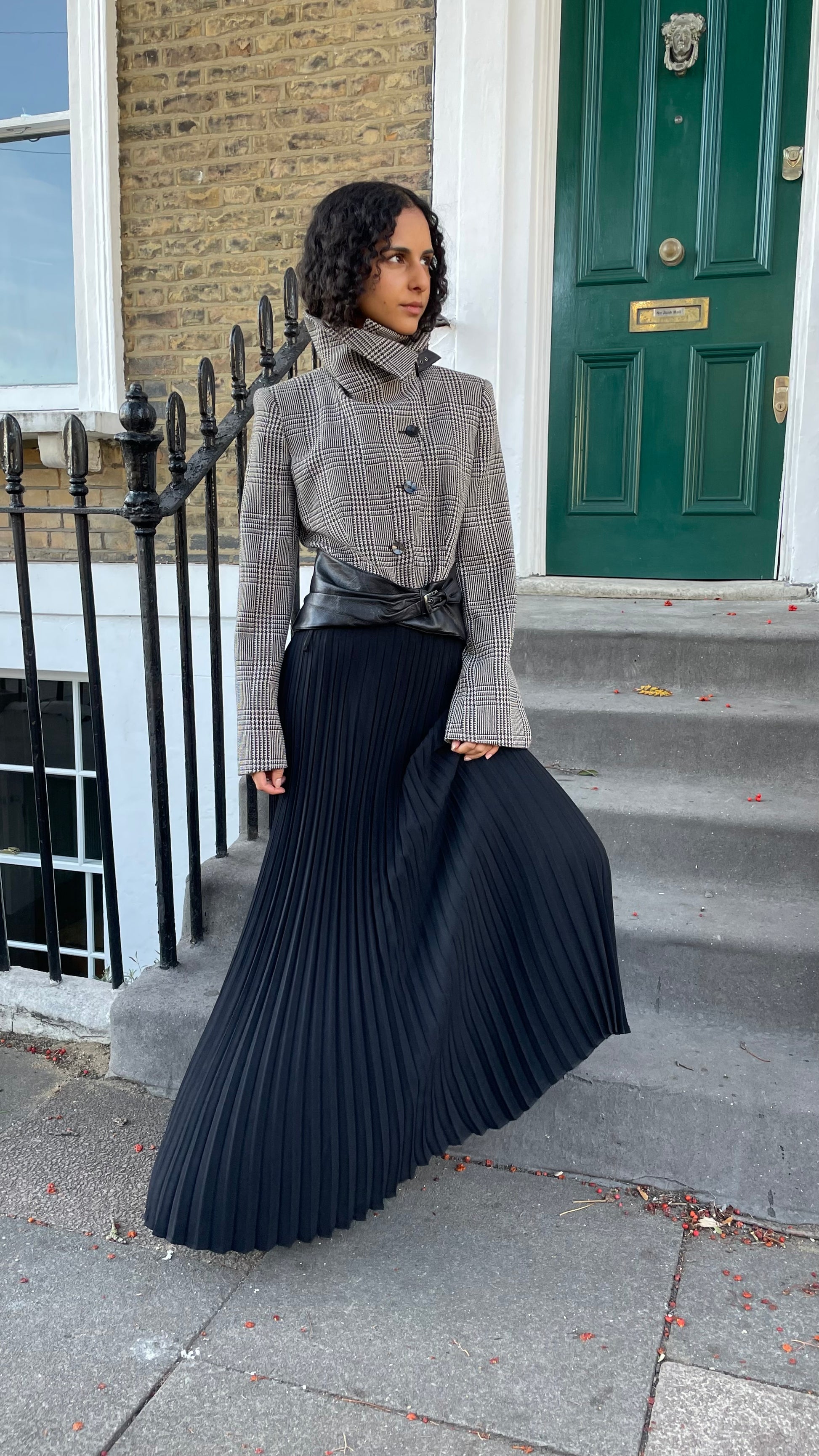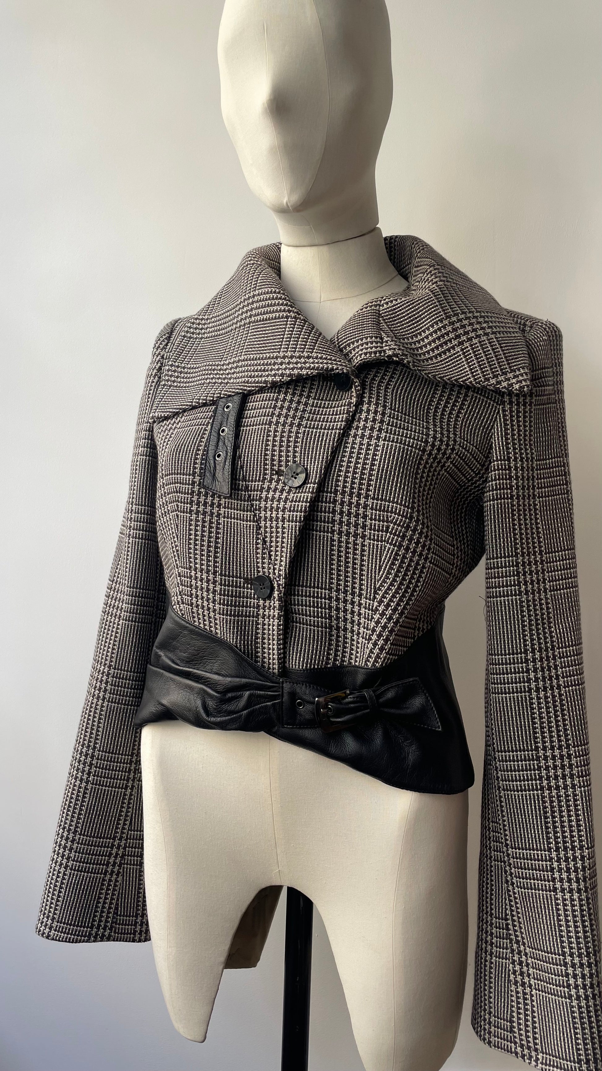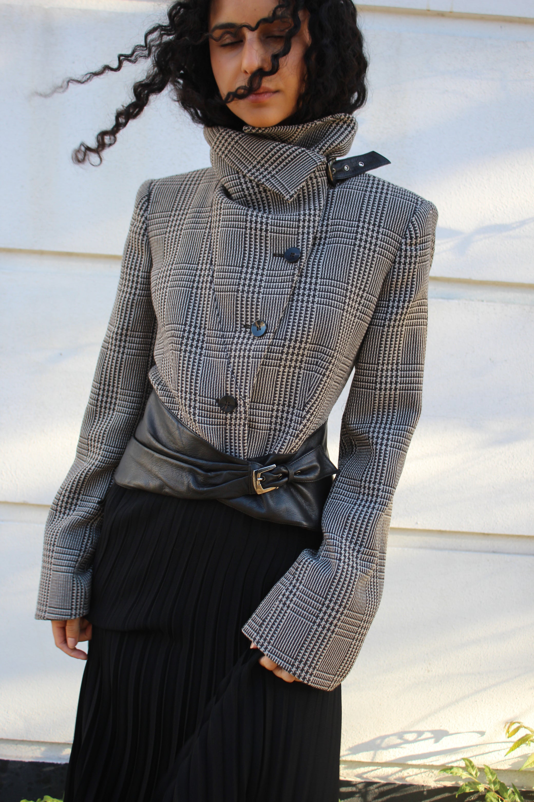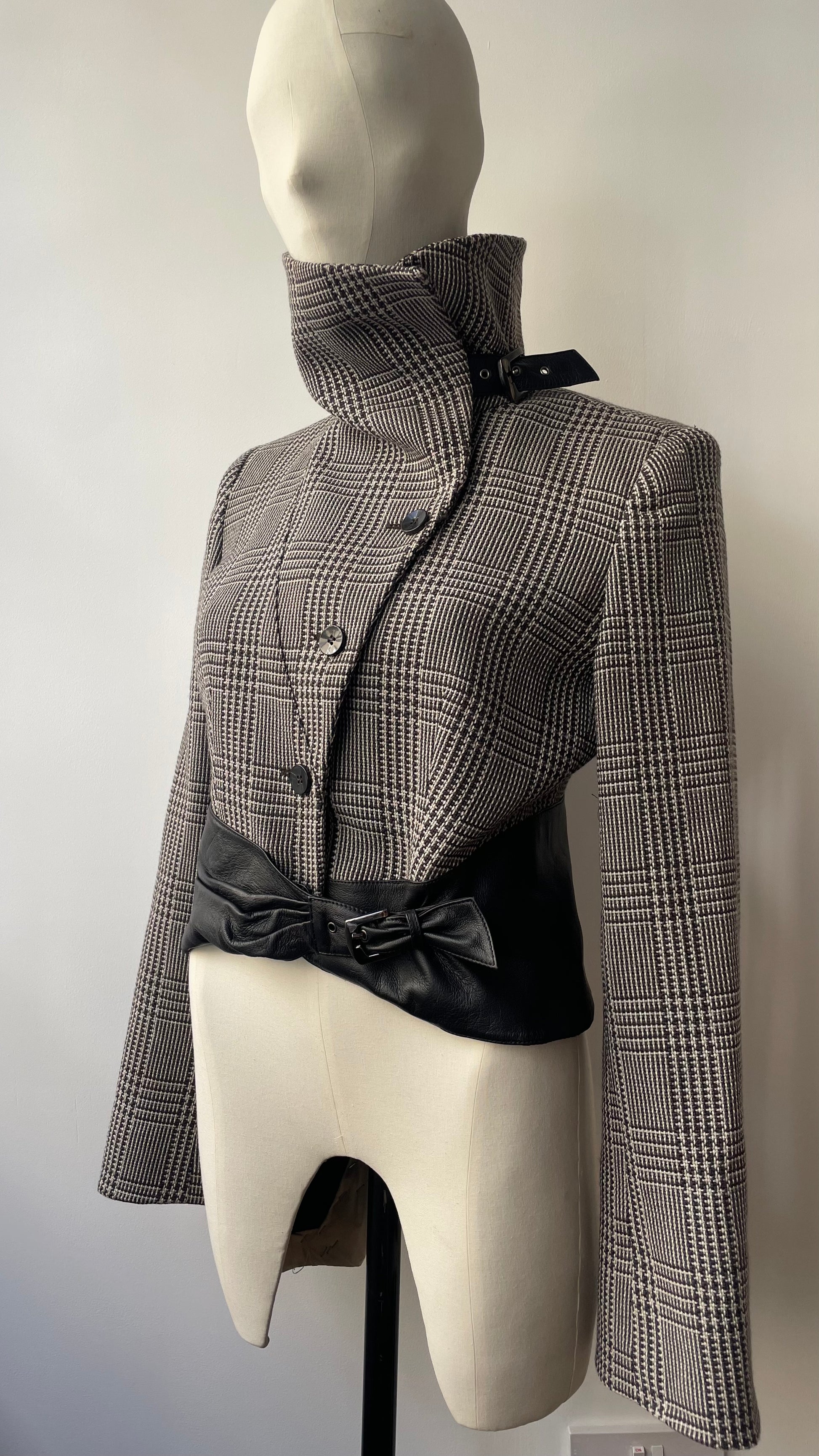 Super elegant Armani Collezioni high neck checked jacket with leather detailing. Perfect paired with high-waisted bottom. Timeless elegance by Armani Collezioni design house. Size 42 IT, best fits size Small.