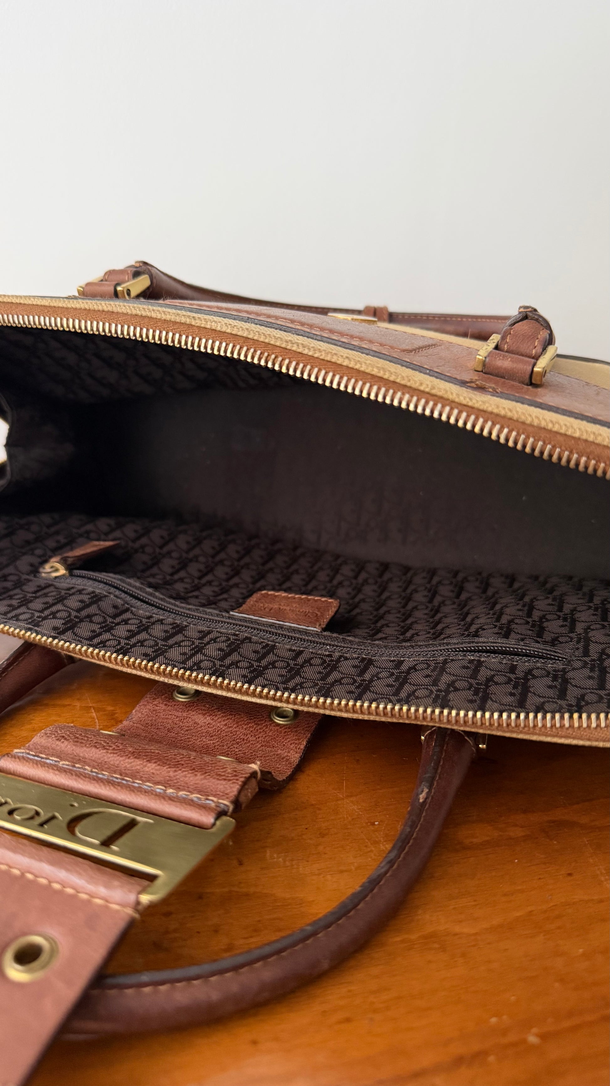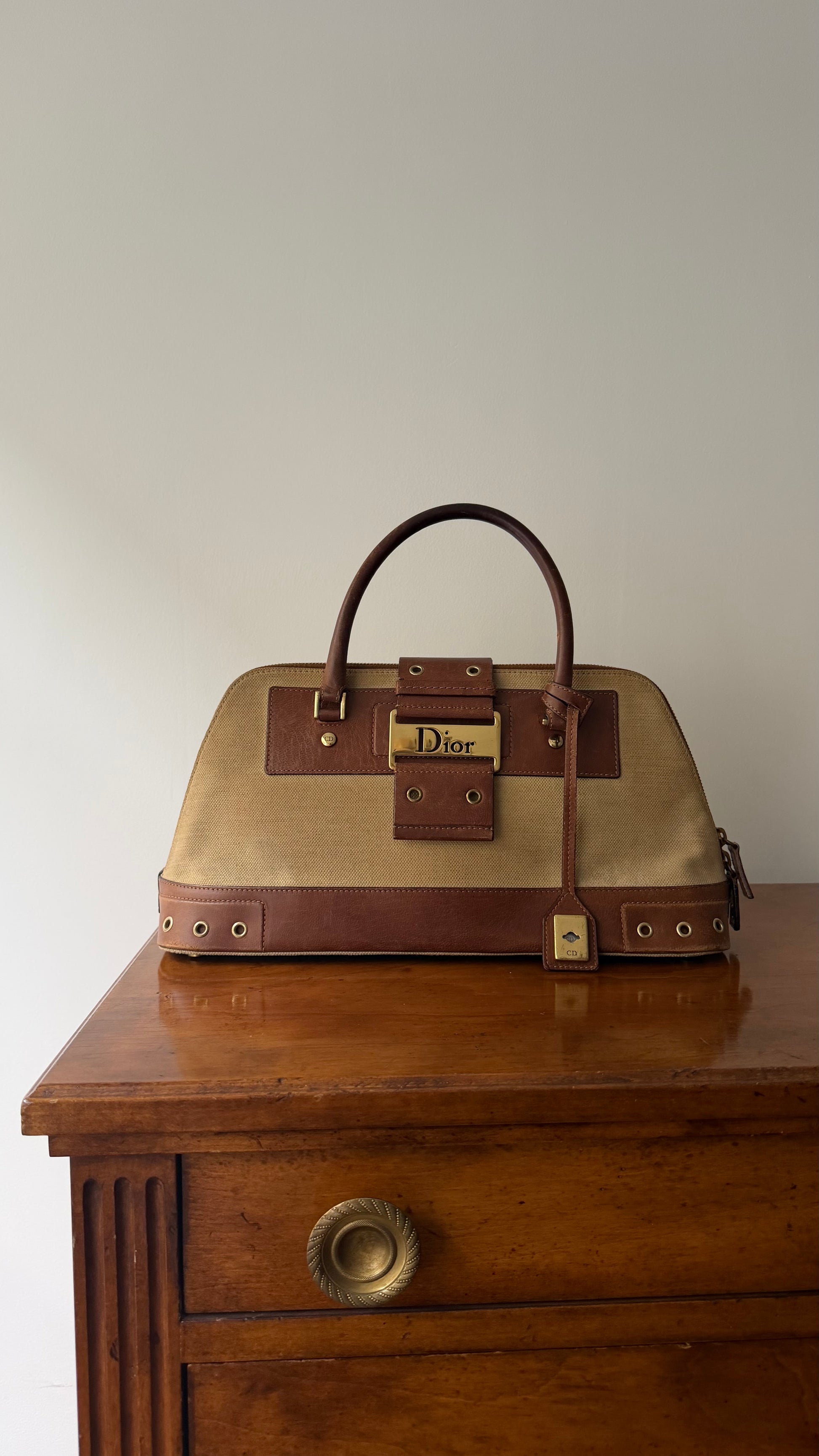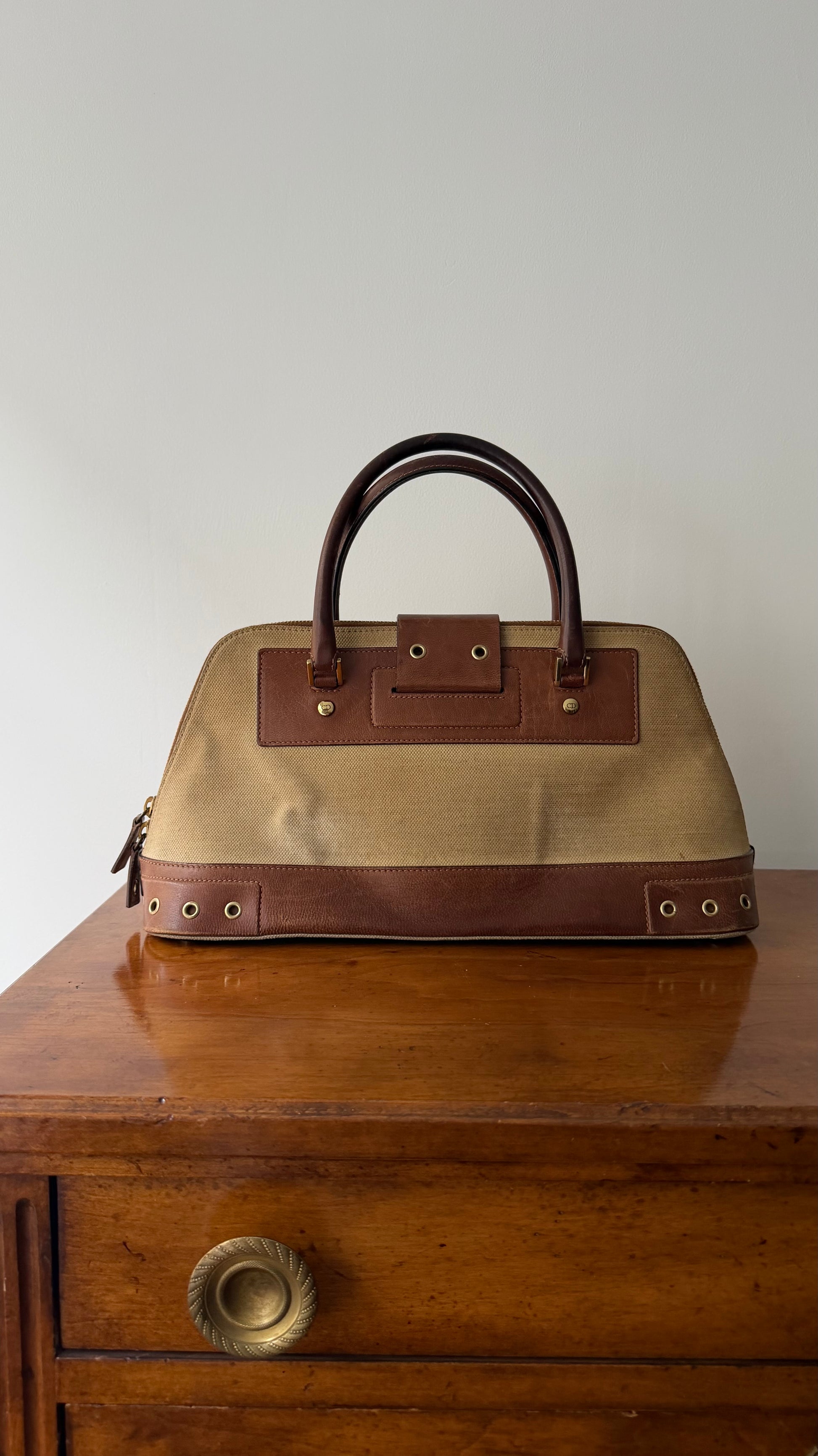 Iconic Dior Spring Summer 2002 collection by John Galliano - top handle version Columbus handbag. Features iconic canvas & tan leather combination with branded Dior plaque and hardware.