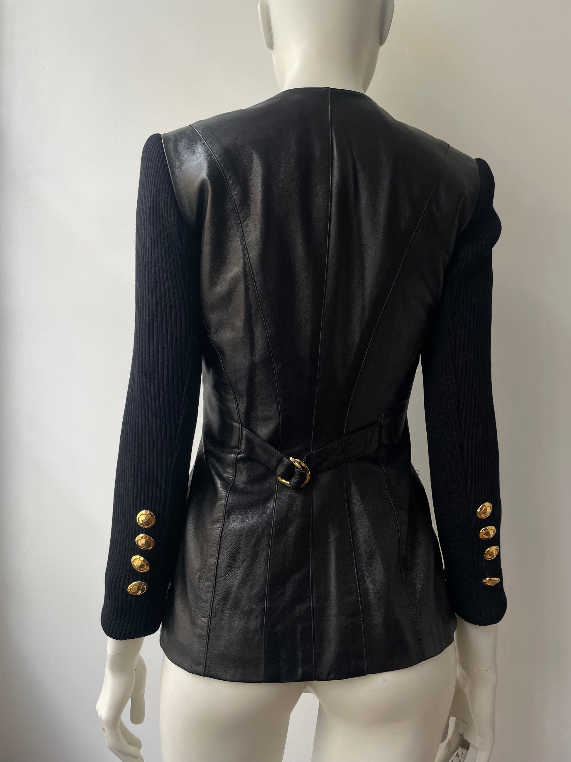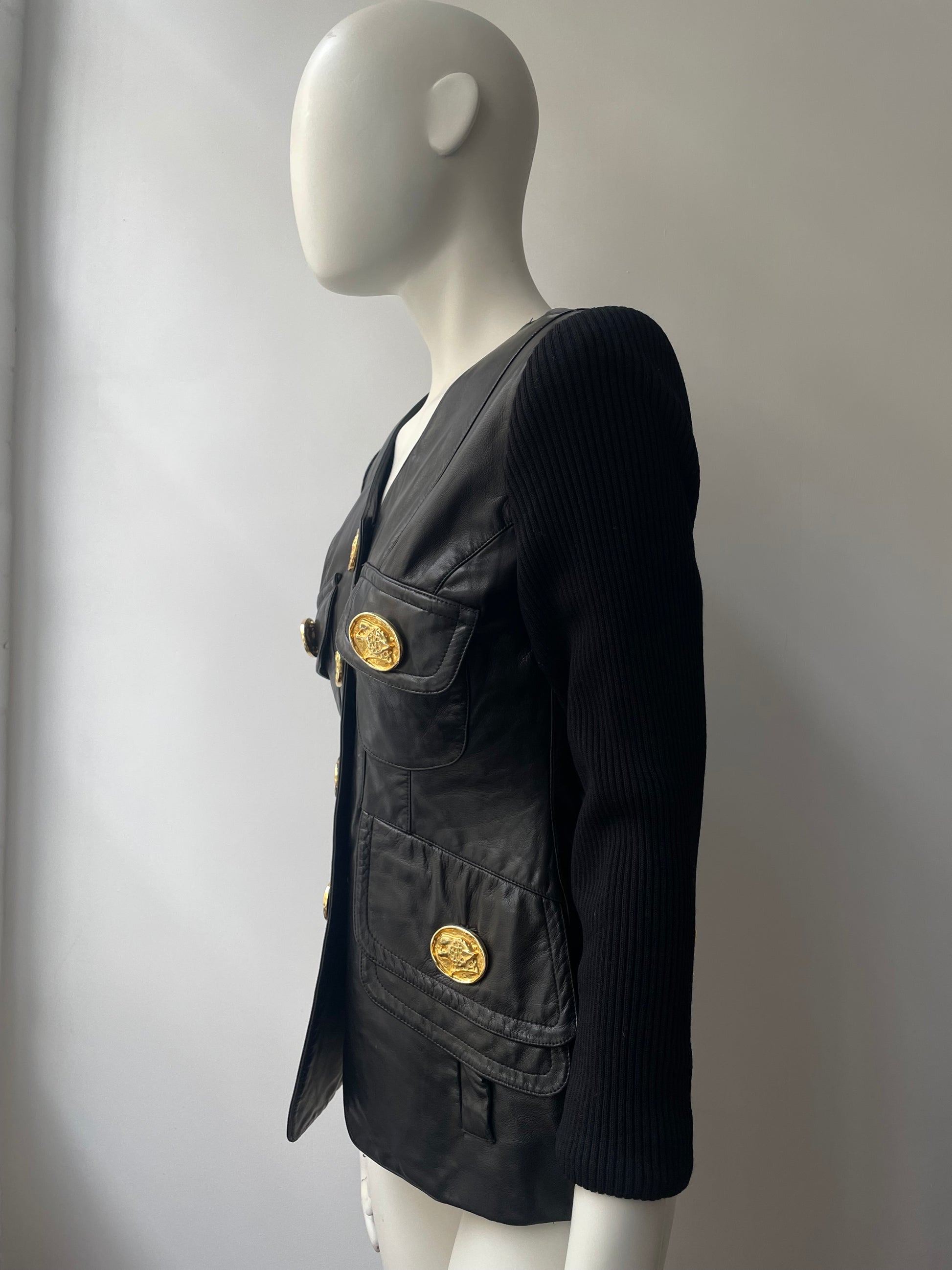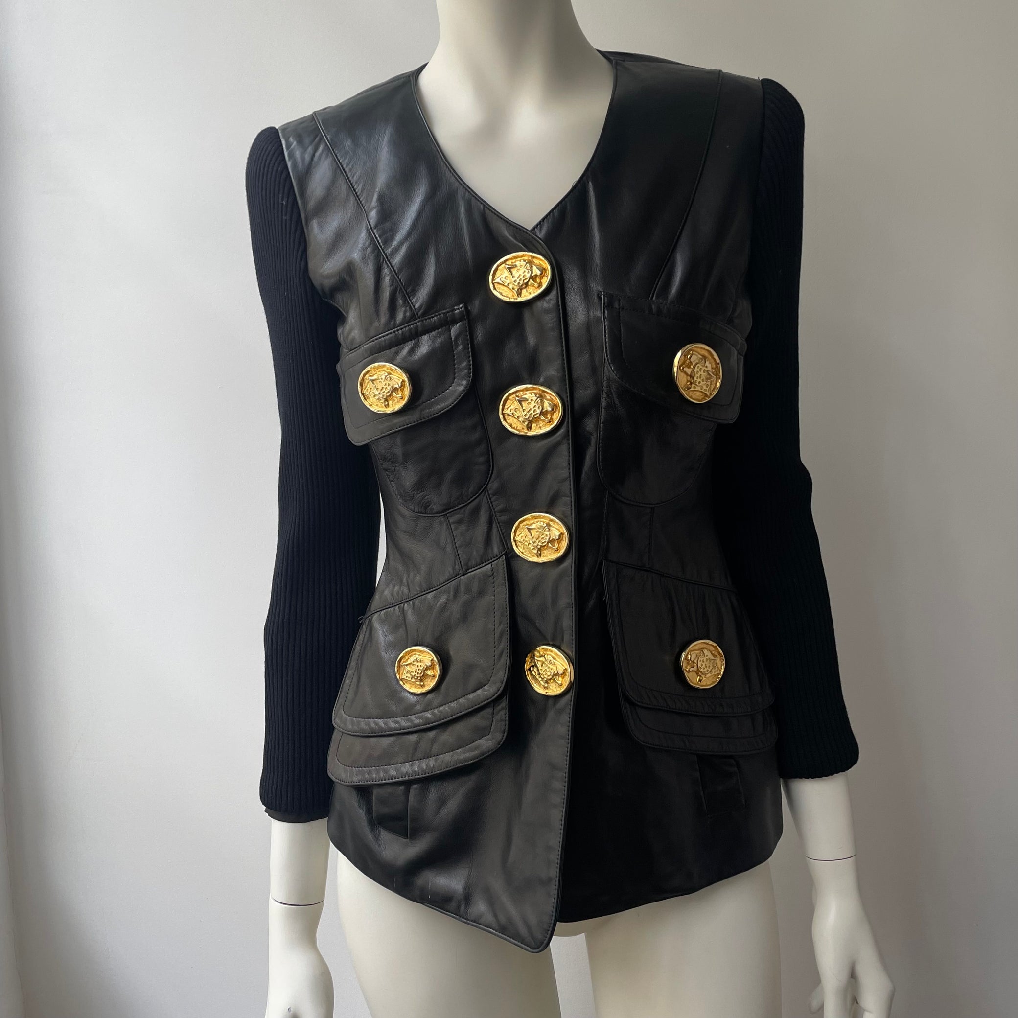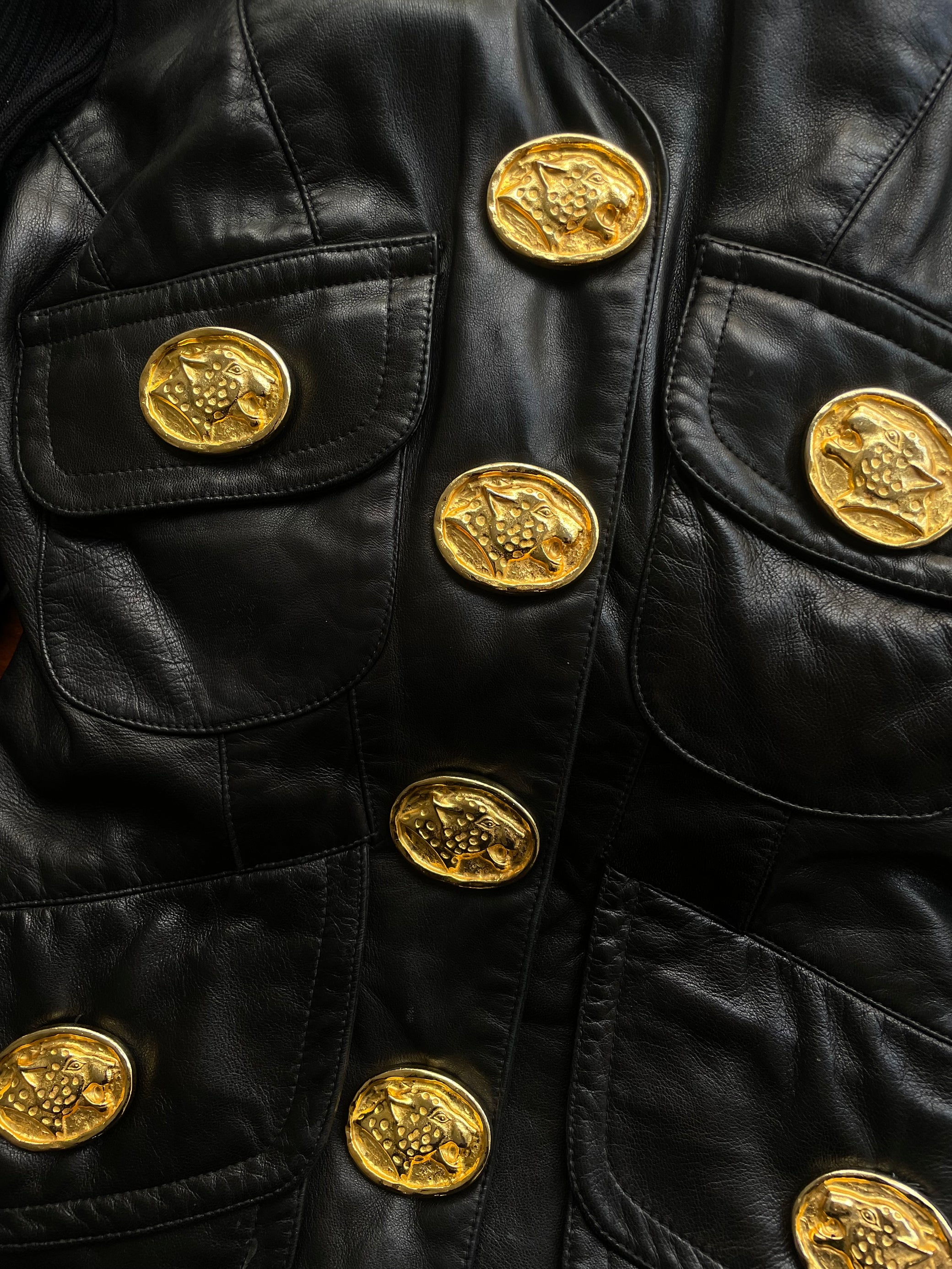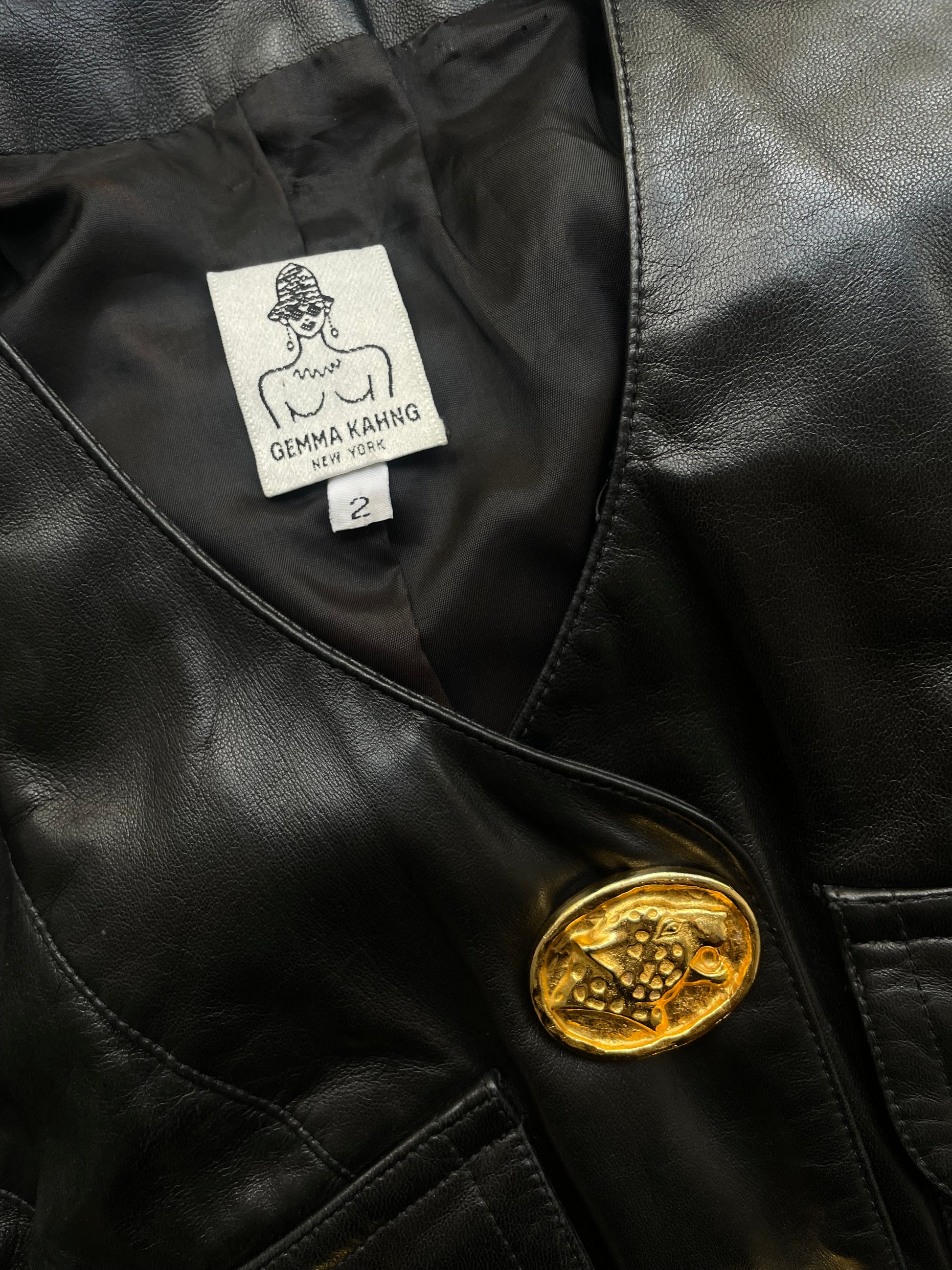 The most stunning statement leather jacket / cardigan by New York designer Gemma Kahng. Features large Cheetah golden tone buttons - making a real statement piece. best fits sizes XS- Small.