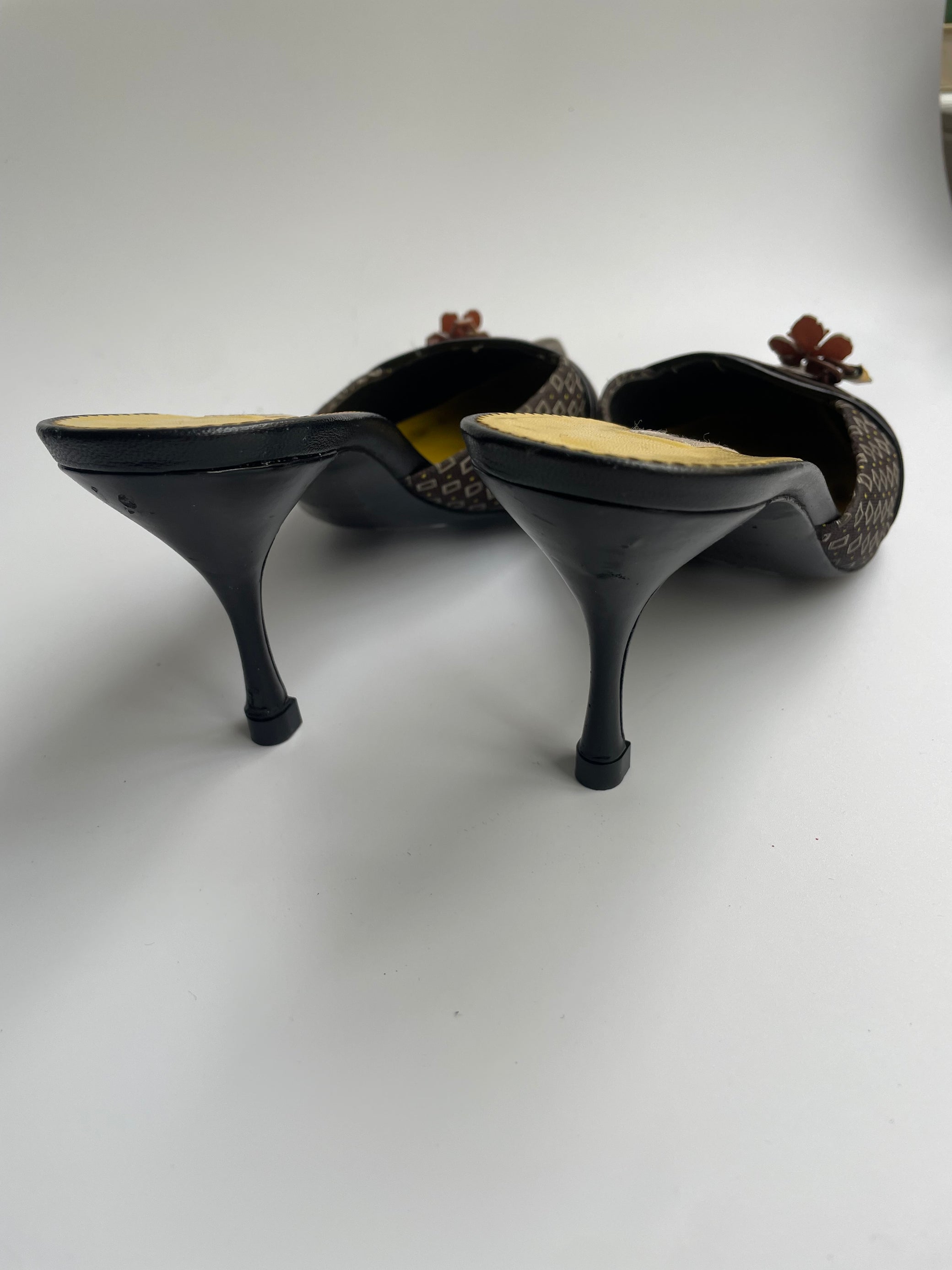 Super iconic vintage Prada 2003 Kimono print mules with flower appliqué. Super chic kitten heel 6.5-7.5cm. Size 38.5 IT - best fits 38.5-39 EU / 5.5-6 UK.