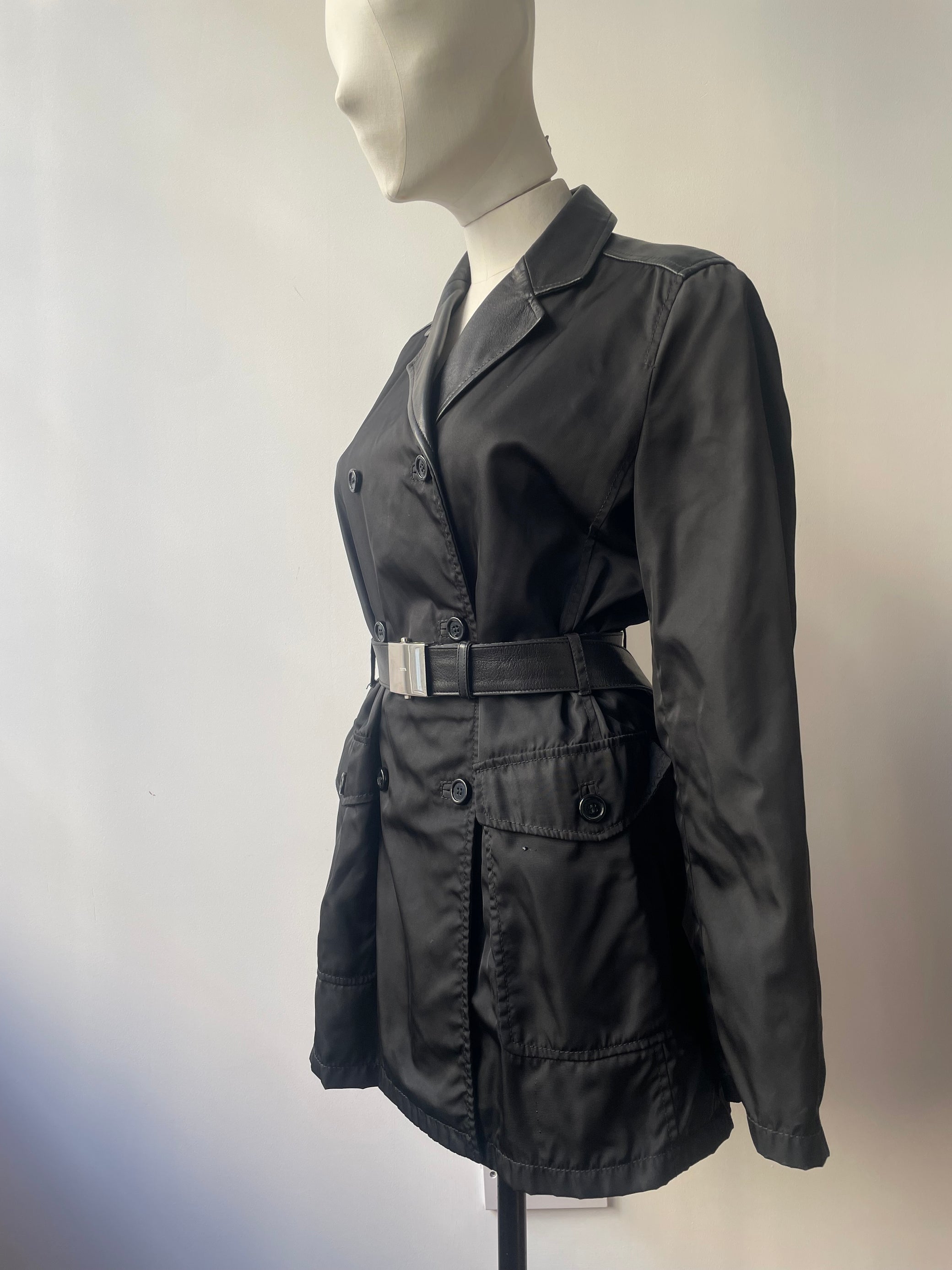 Vintage Prada Autumn / Winter 1994 belted trench coat in nylon. Features leather detailing on shoulders and lapels. Timeless minimalist chic Prada shape. Size Medium.