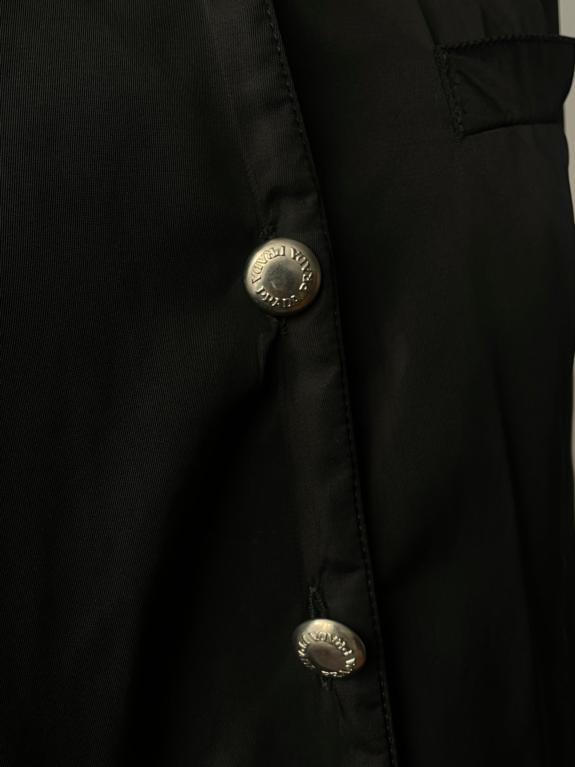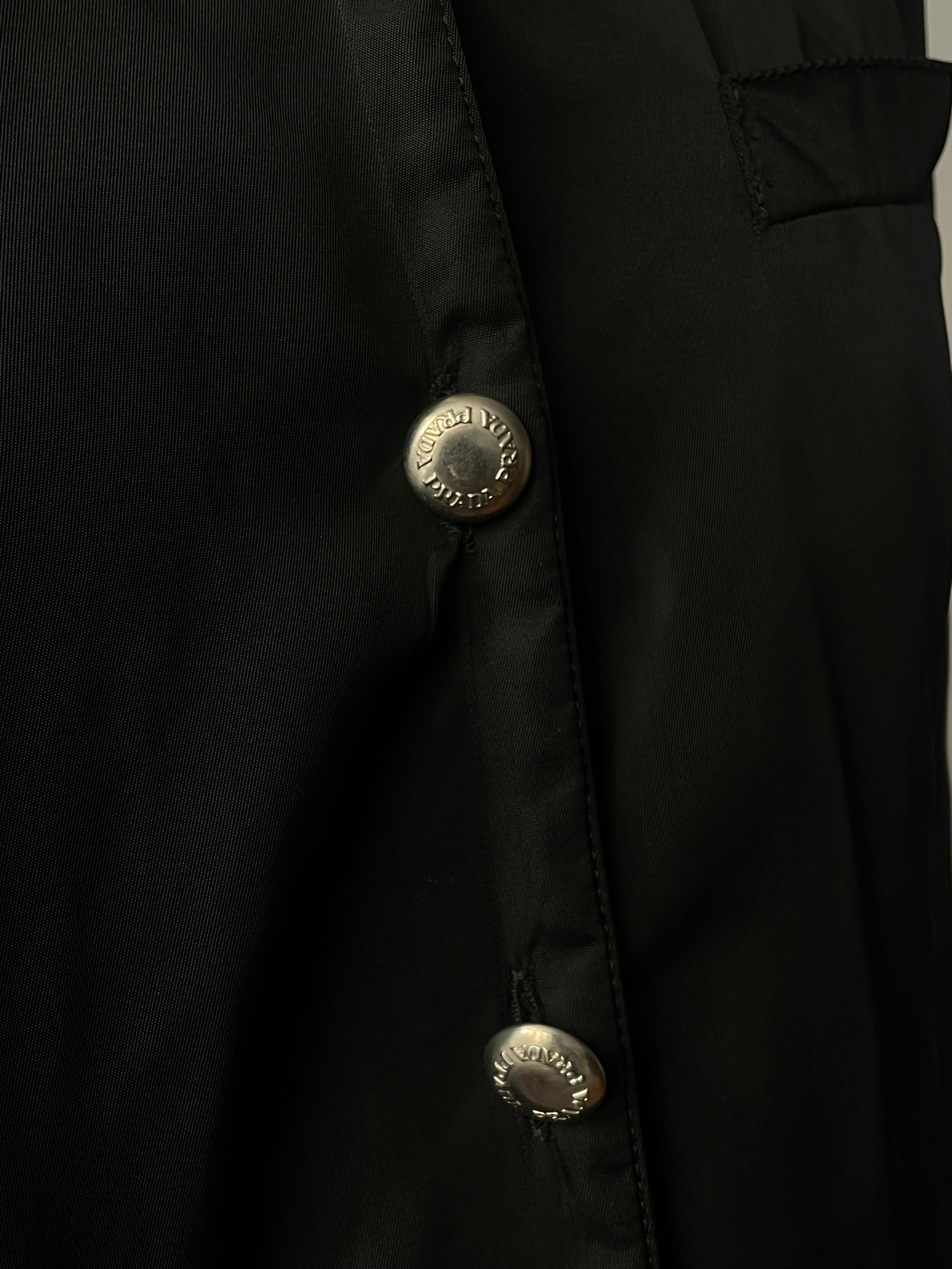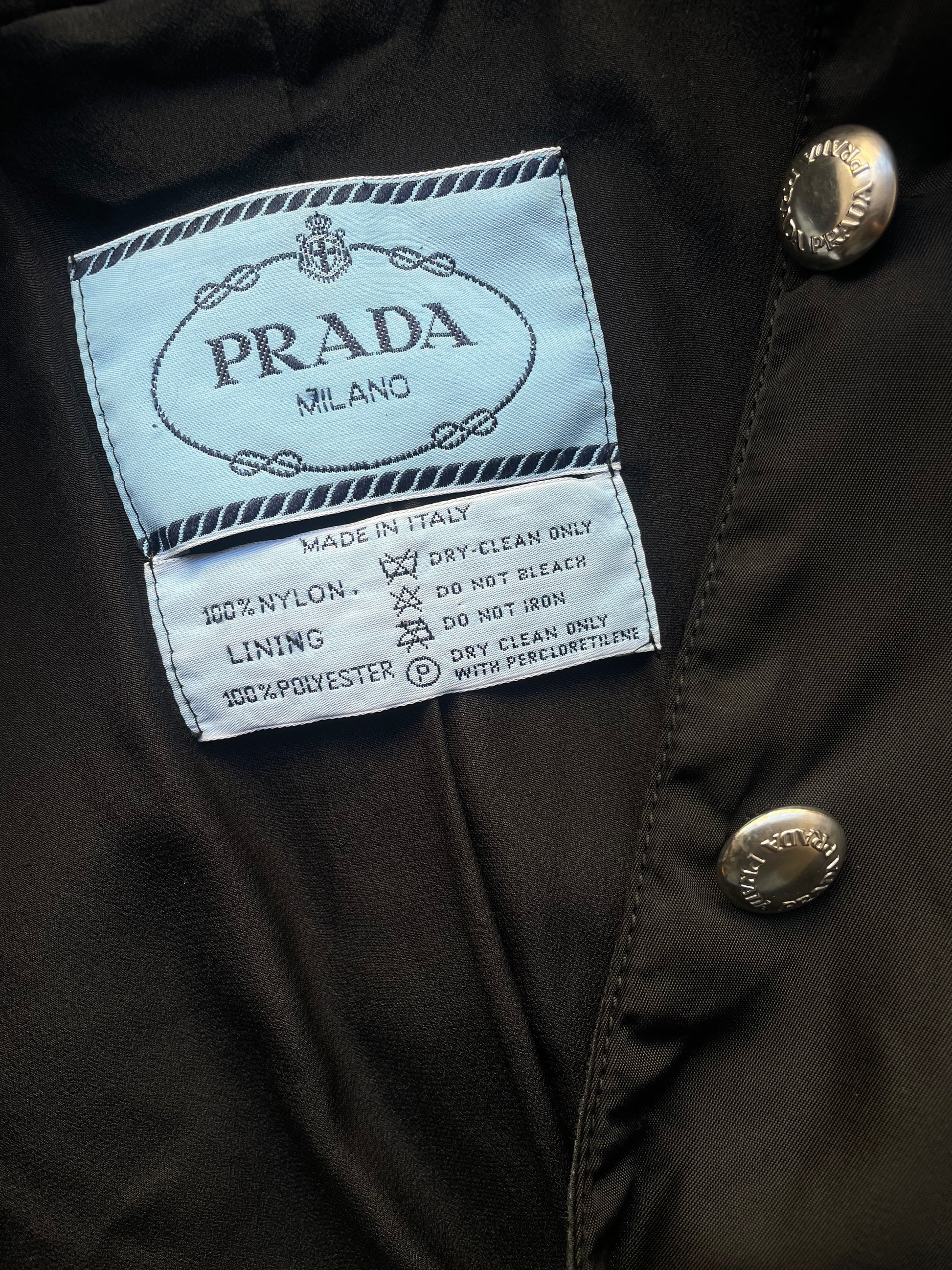 Prada Autumn/ Winter 1994 runway (look 2) nylon button-up jacket, featuring branded buttons. An absolutely timeless minimalist style by Prada fashion house. Perfect piece for a rainy weather due to practical nylon fabrics qualities. Size Large. Measurements: