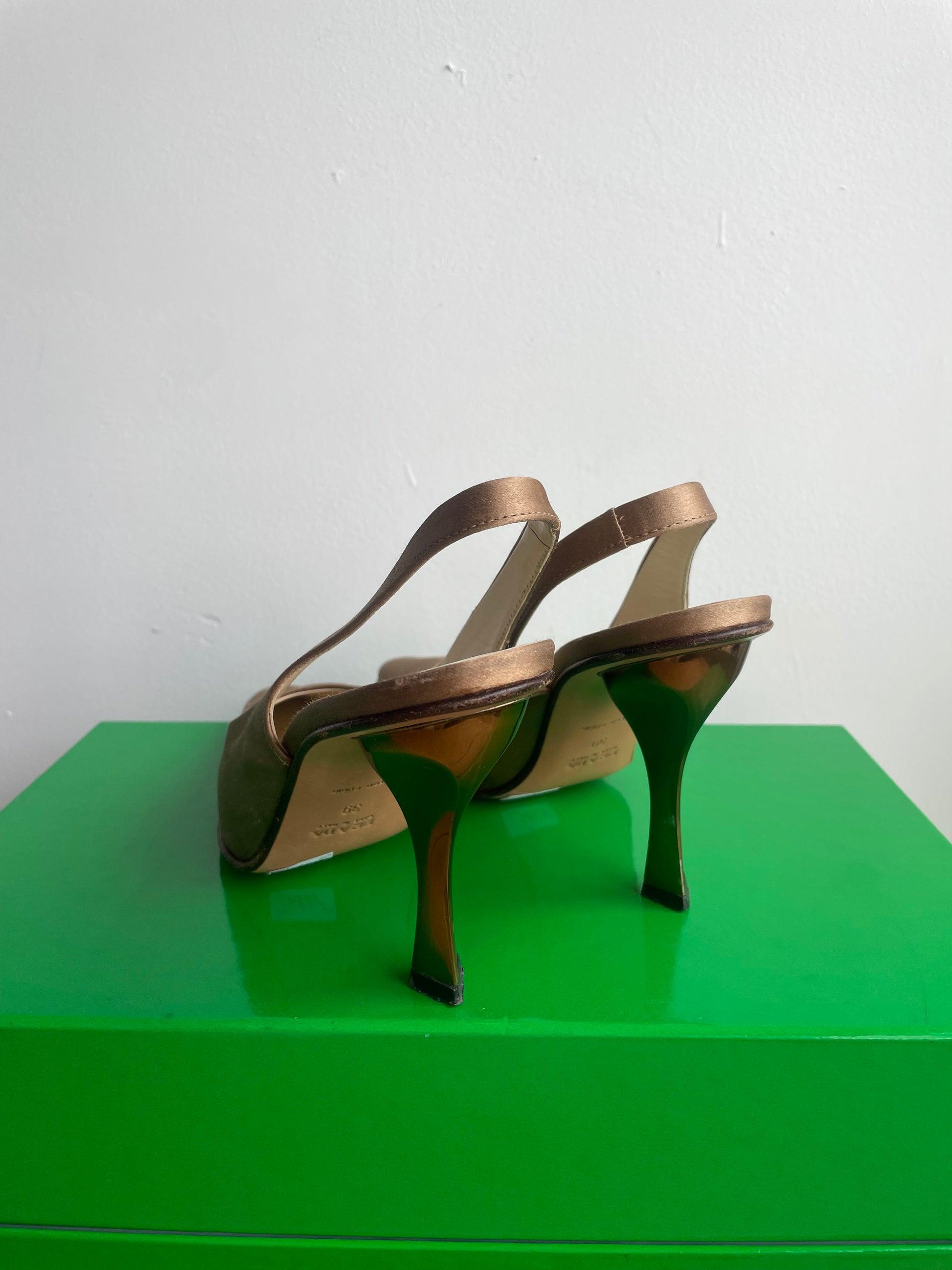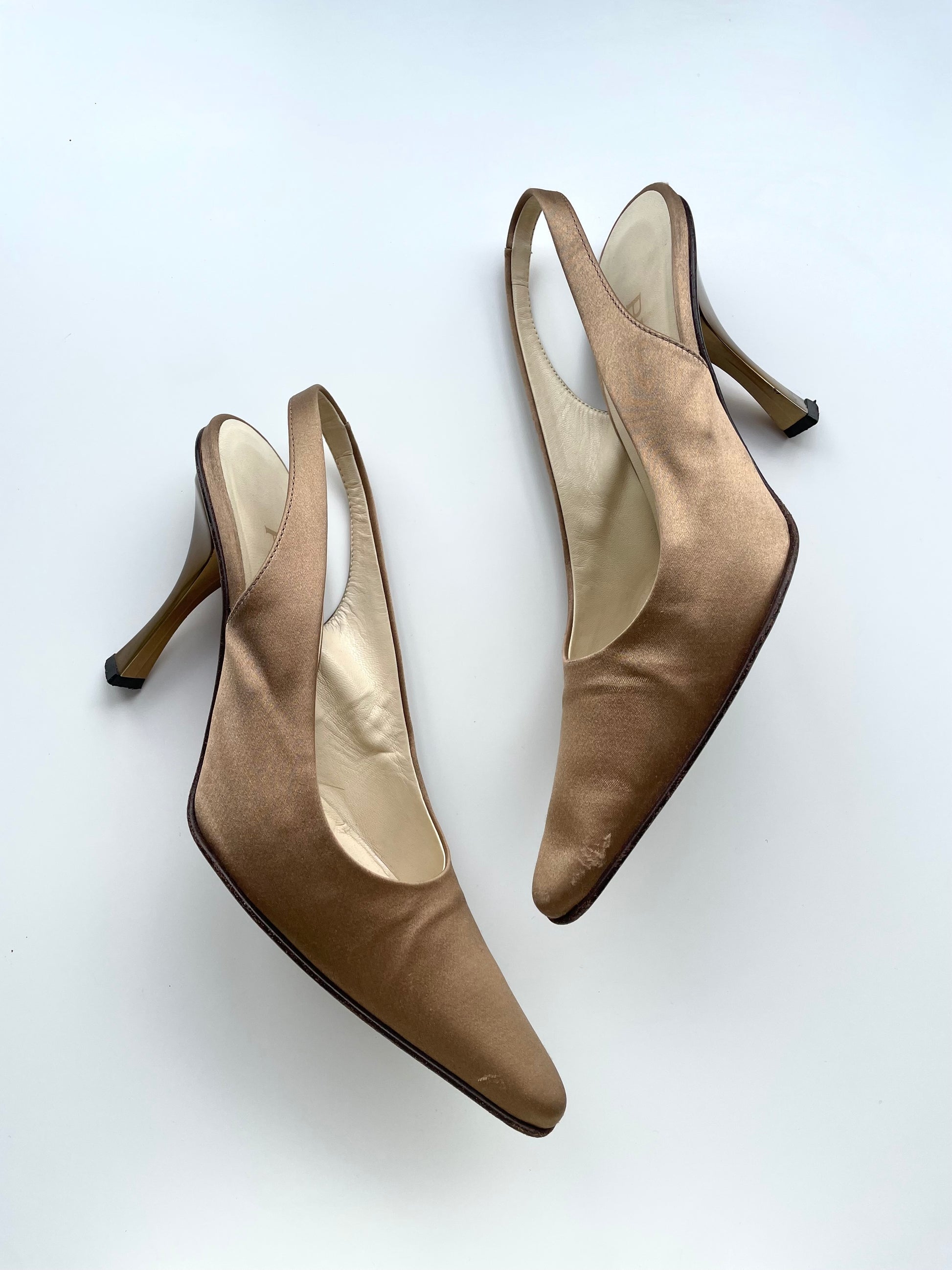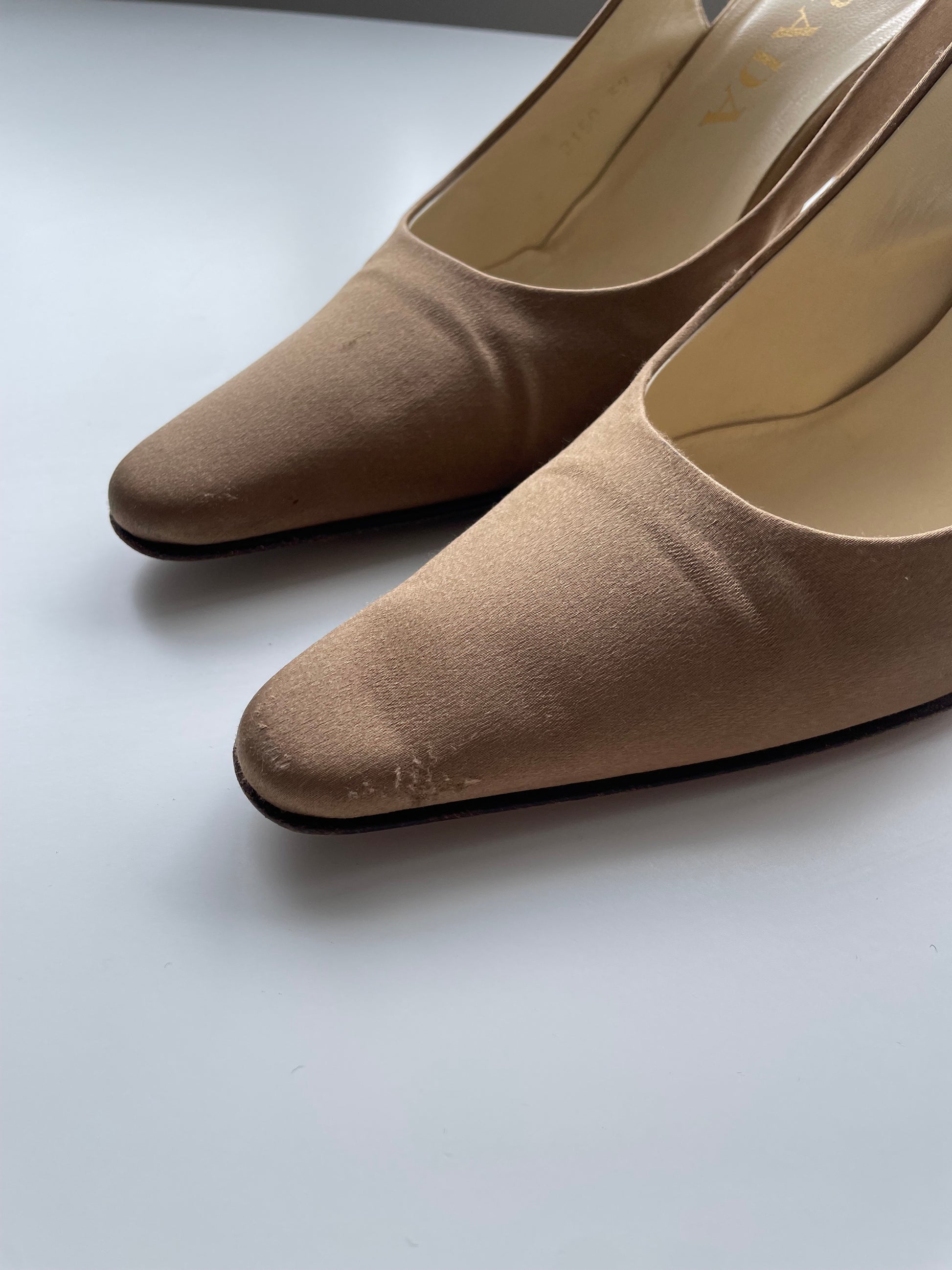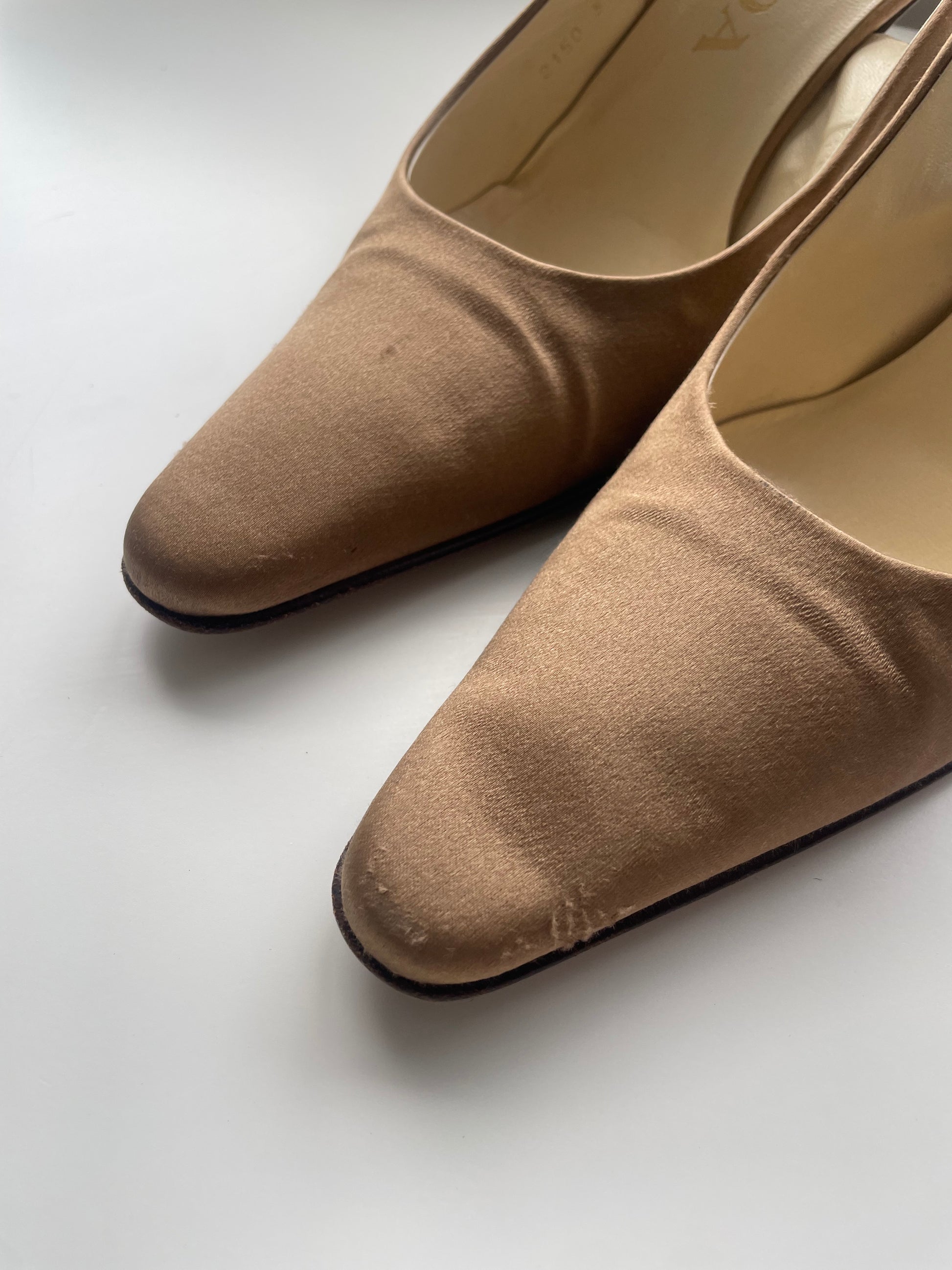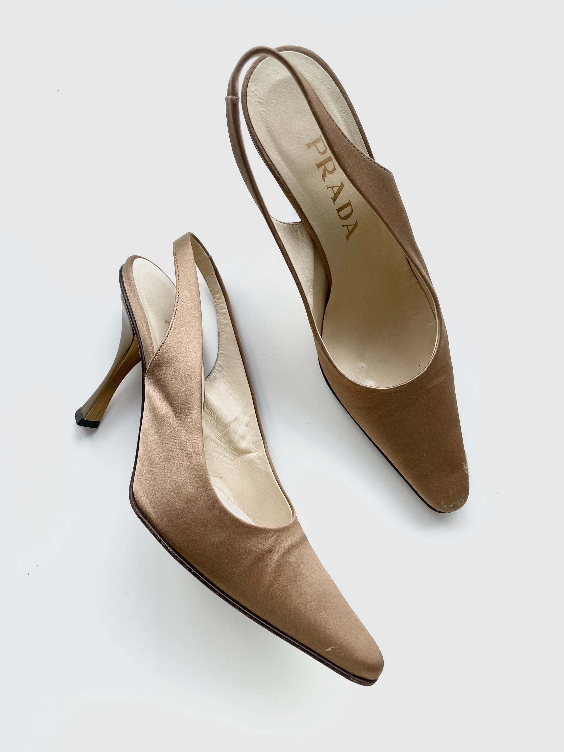 1990’s vintage Prada beige satin slingback courts - super elegant and chic. Please note a slight wear signs on the satin, particularly the front sides. Size 39 IT / 6 UK. Heel height 9.5-10cm