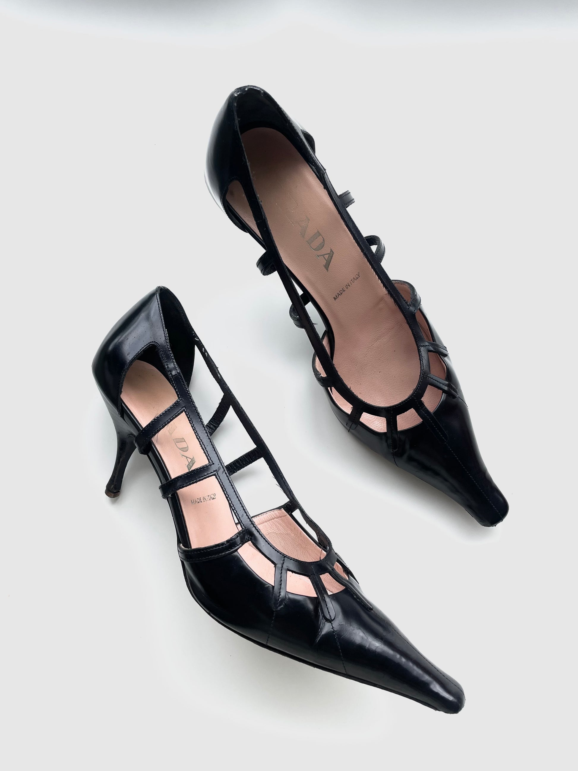 Prada bondage style glossy leather kitten heel vintage 1990’s courts 38.5
