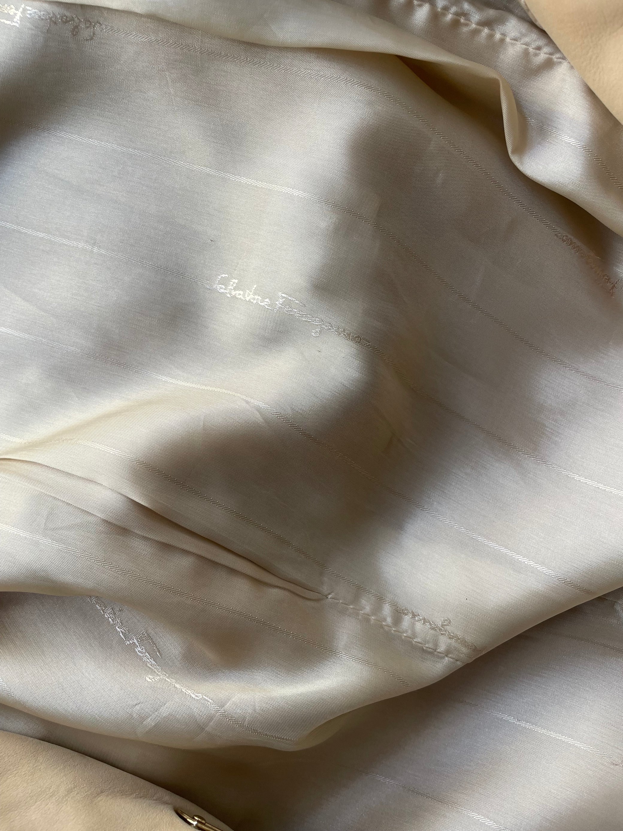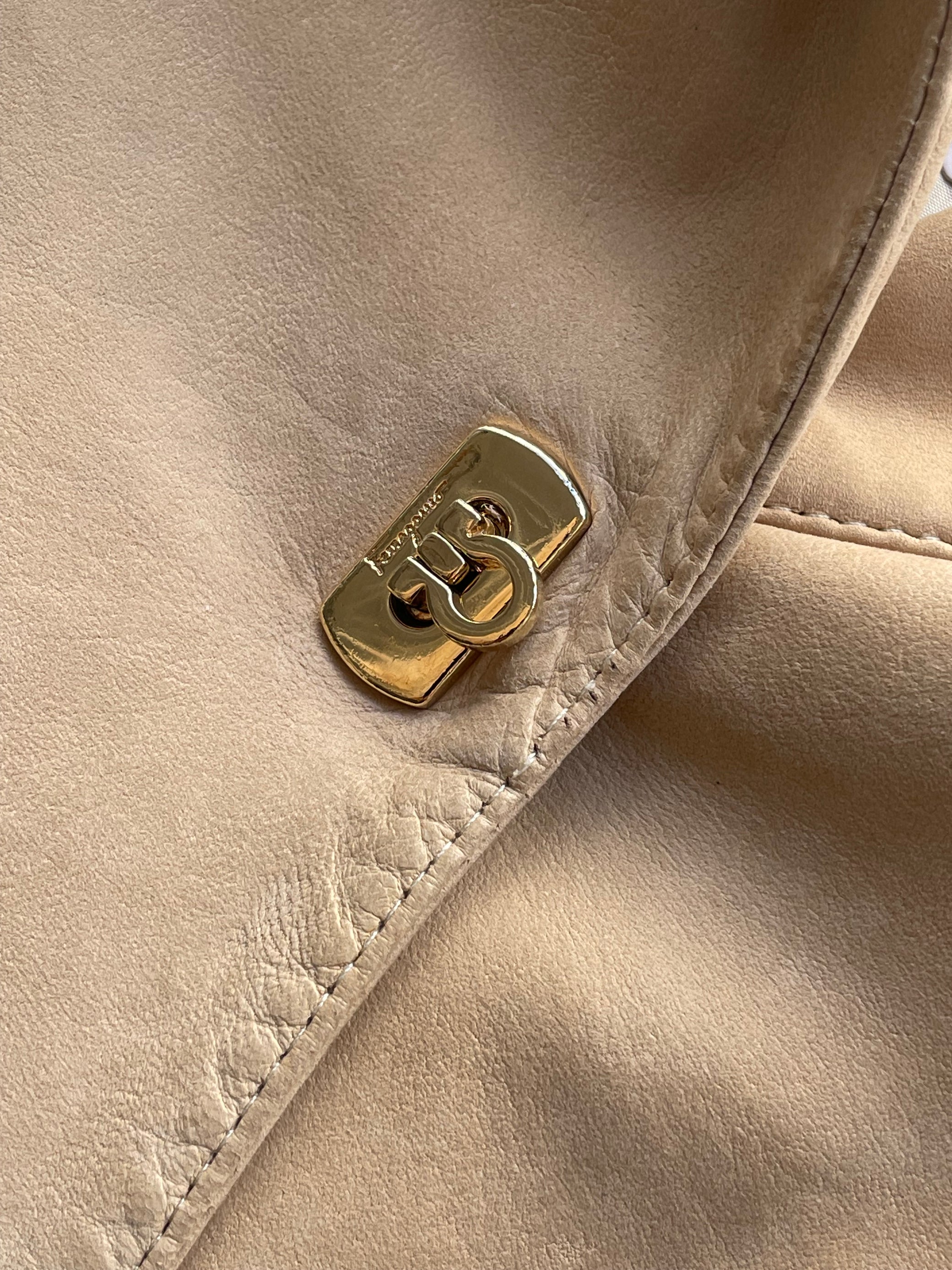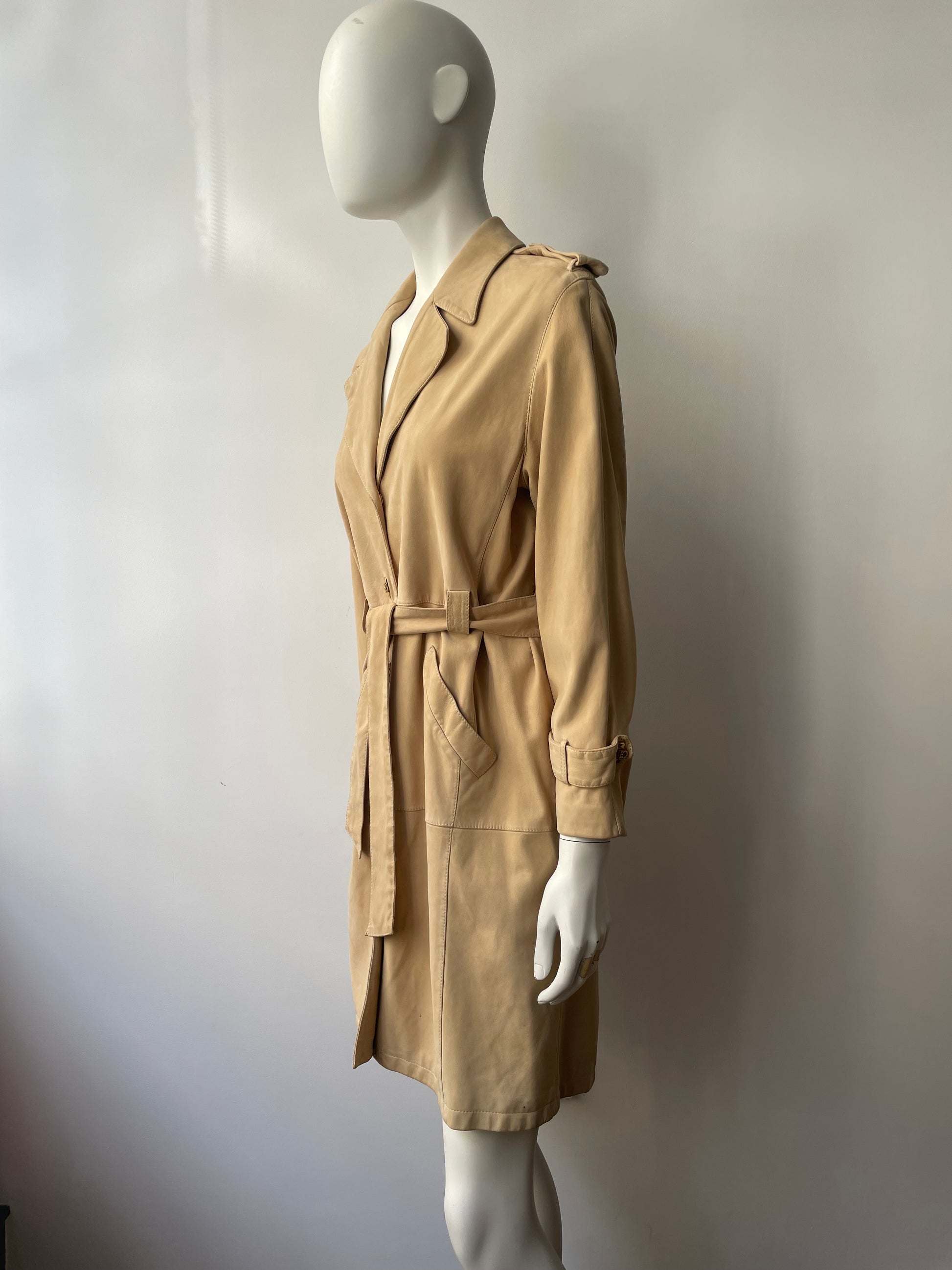 True luxury super soft nubuck leather trench coat by Salvatore Ferragamo. Features signature Ferragamo branded clasp closure. Size 44 IT.