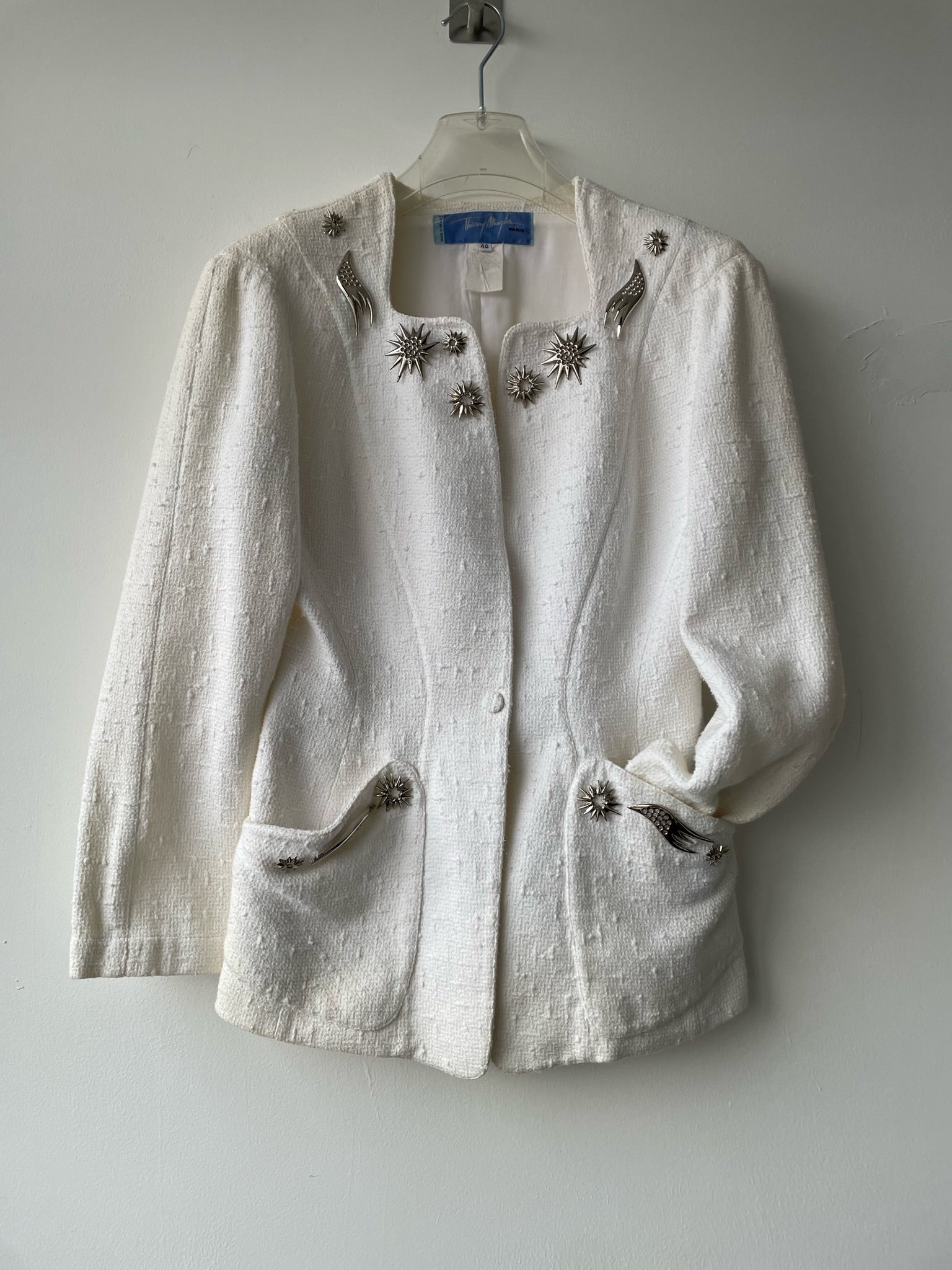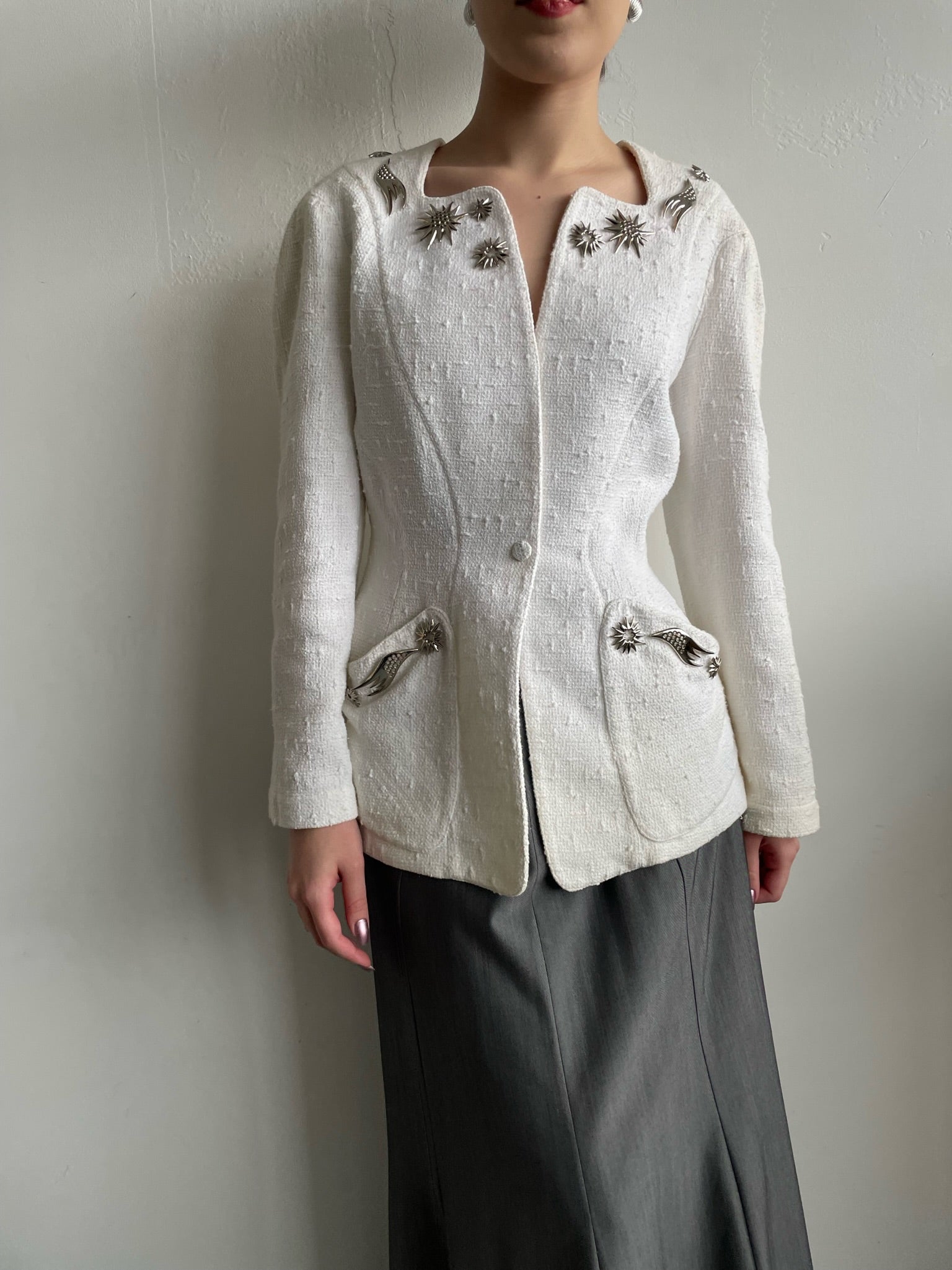 Thierry Mugler FW90s white textured blazer with stunning silver metal starburst accents. Sharp tailoring with signature sculpted fit. Size FR 40. Please note – has some aged stains near the shoulders and collar, along with minor flaws (highlighted in pictures). Otherwise, the condition is great. A rare and collectible piece from Mugler’s iconic era.