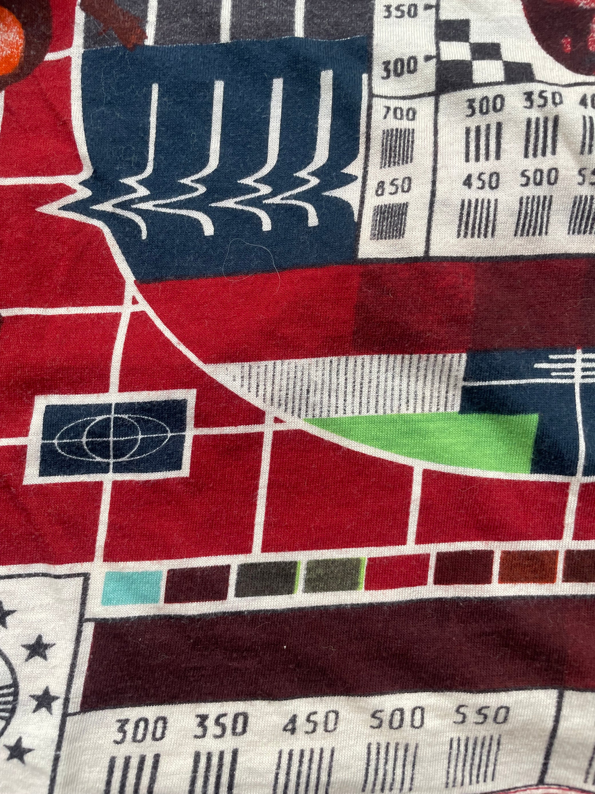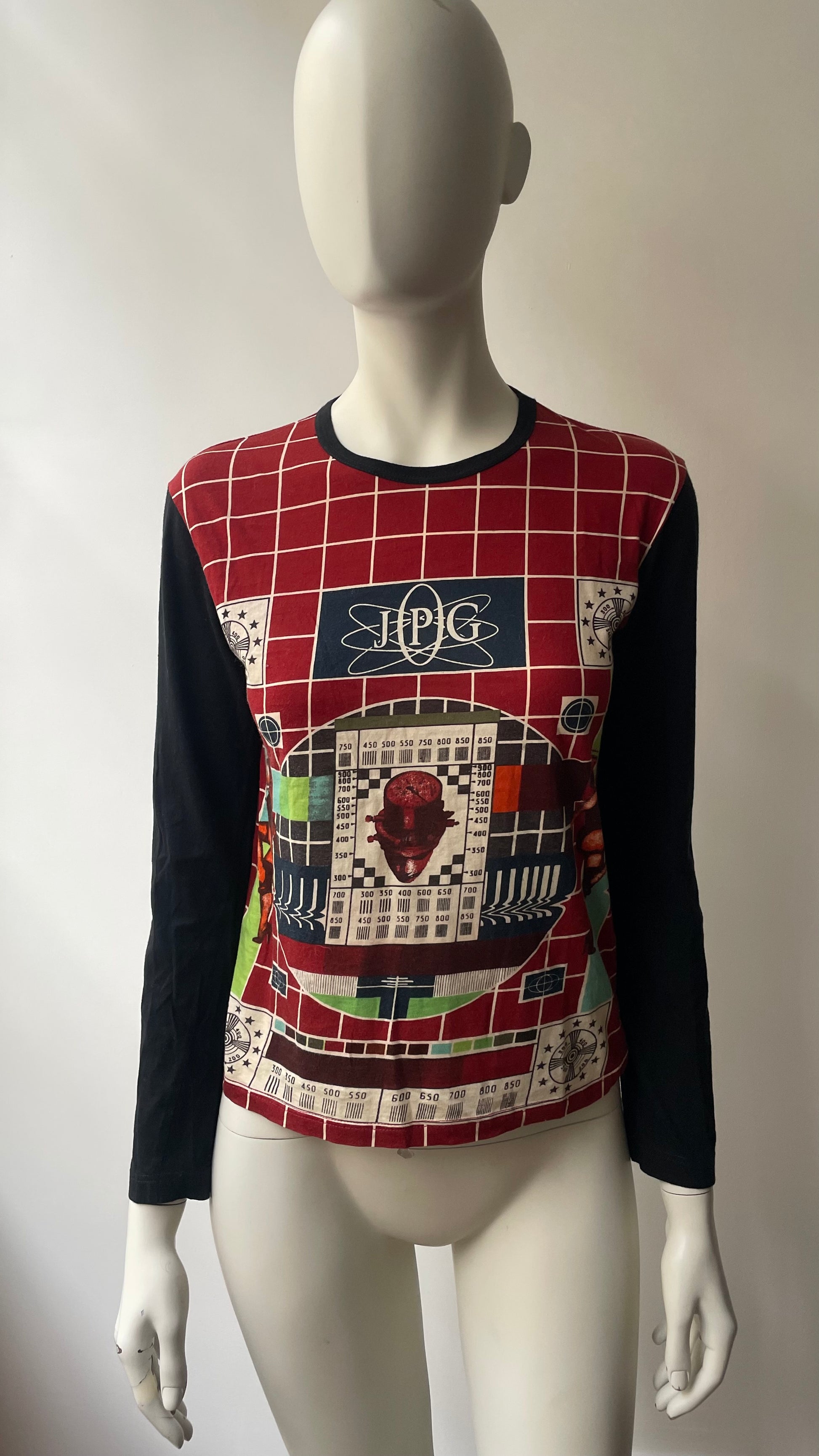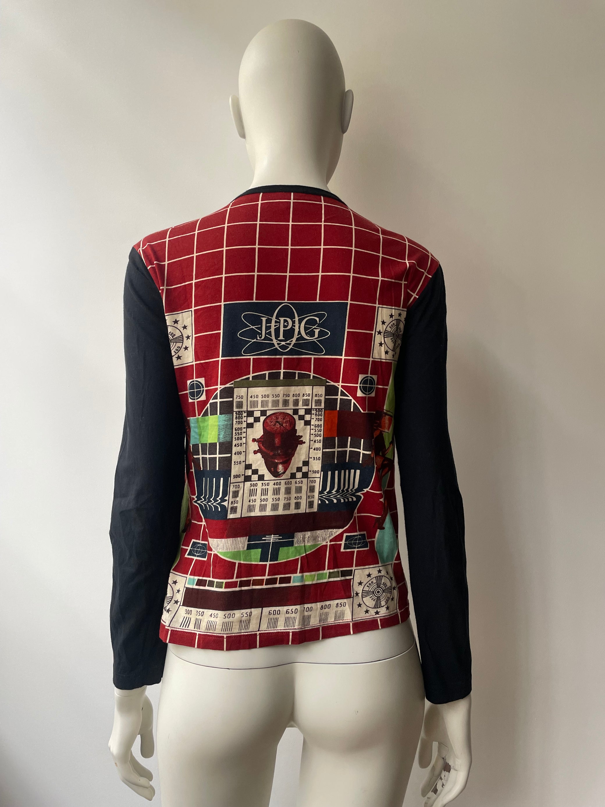 Iconic 1994 Jean Paul Gaultier ‘TV Test’ collection’s printed top- super rare and collectible piece. Size Large- would be semi-loose fit for size Small-Medium. Measurements: