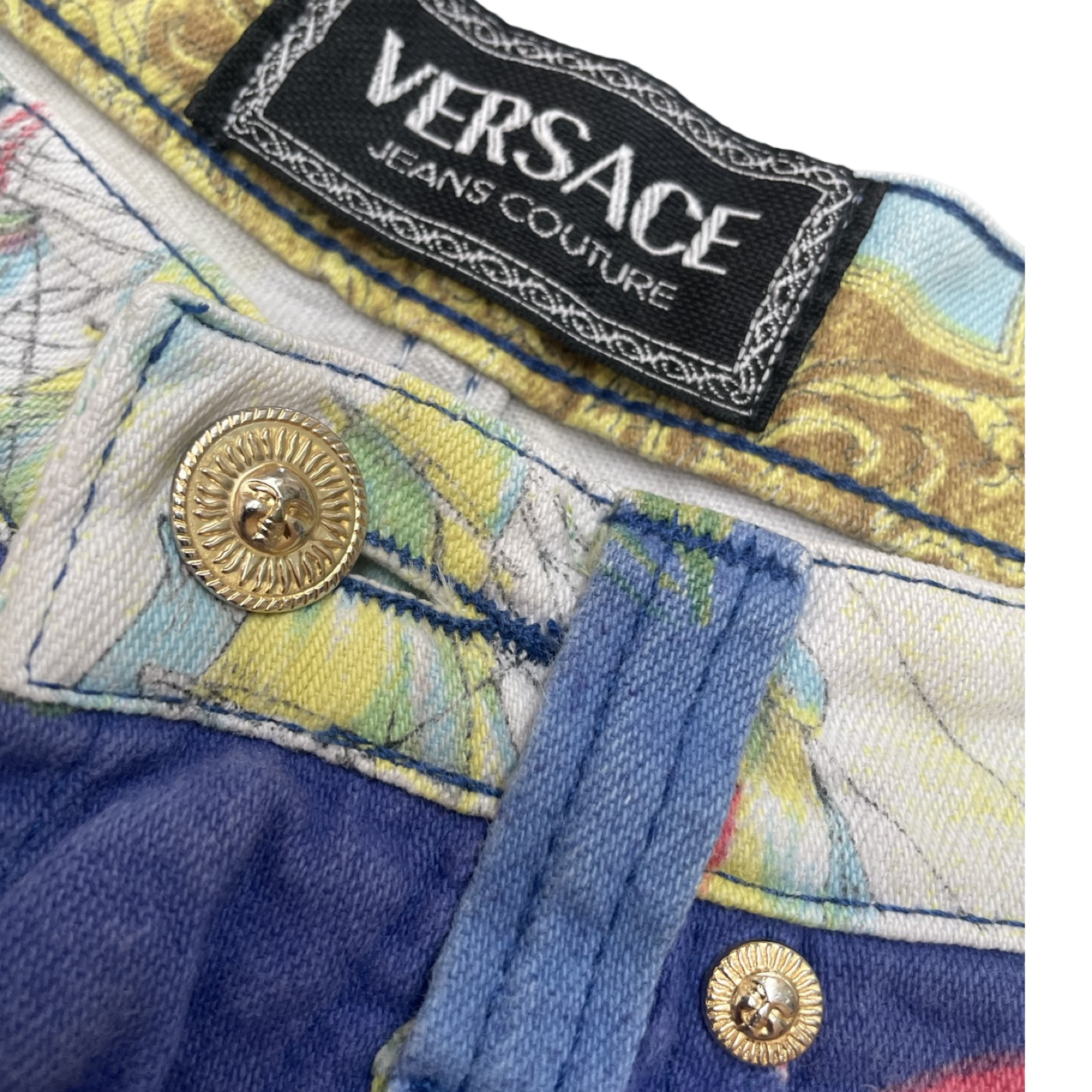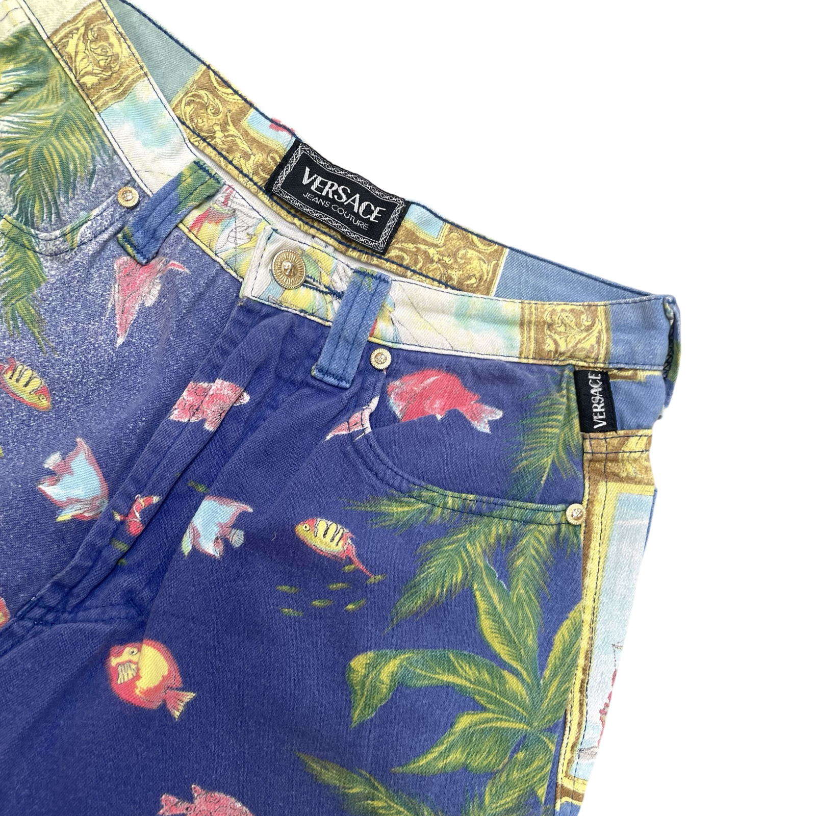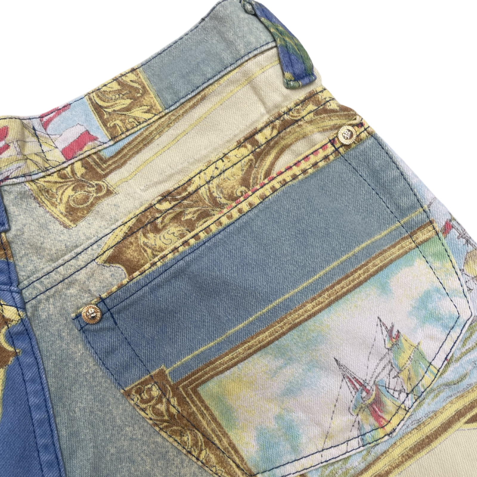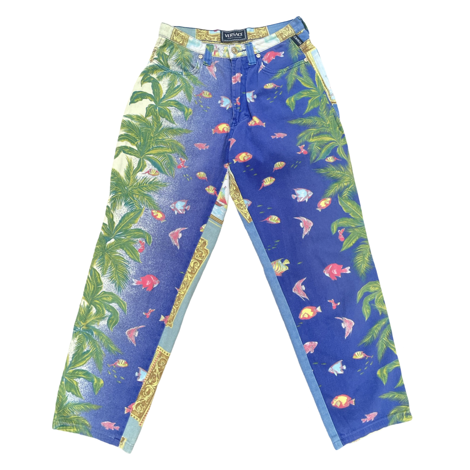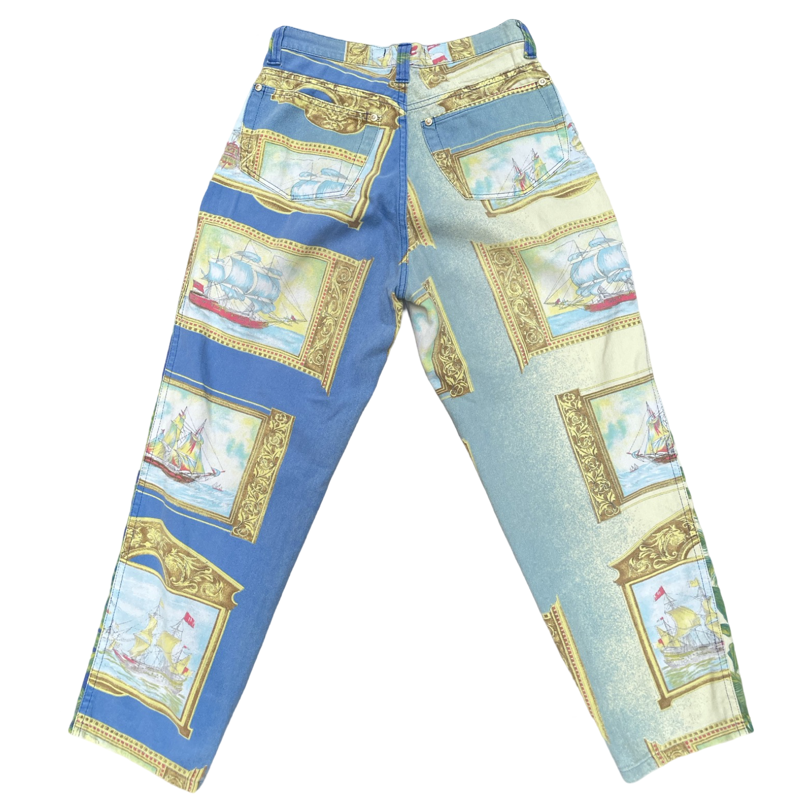 Such amazing and unique Vintage Versace in ocean / fish / baroque / aqua / aquatic / ship sails print. Amazing collectible printed jeans from 90’s Versace collection.