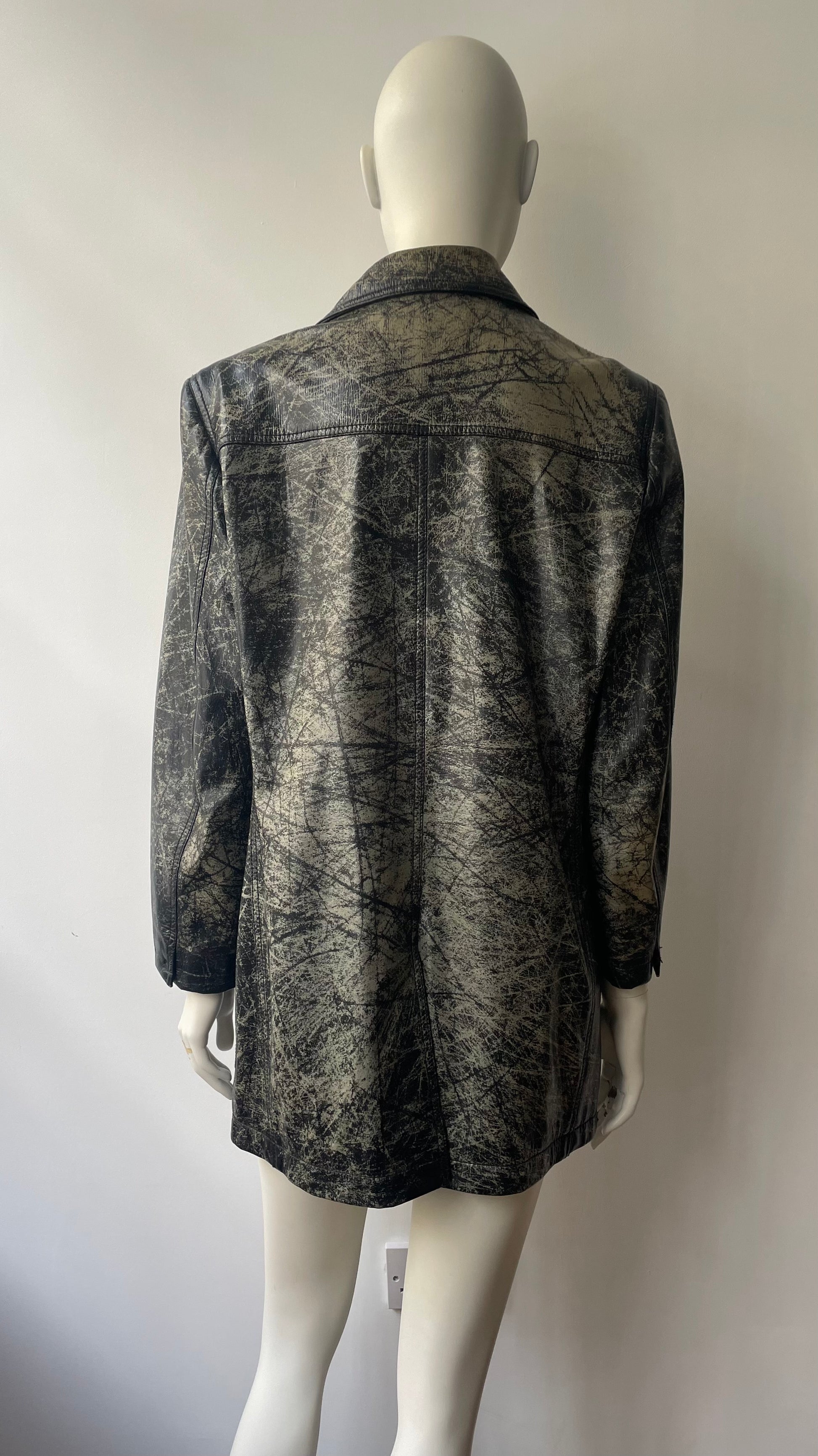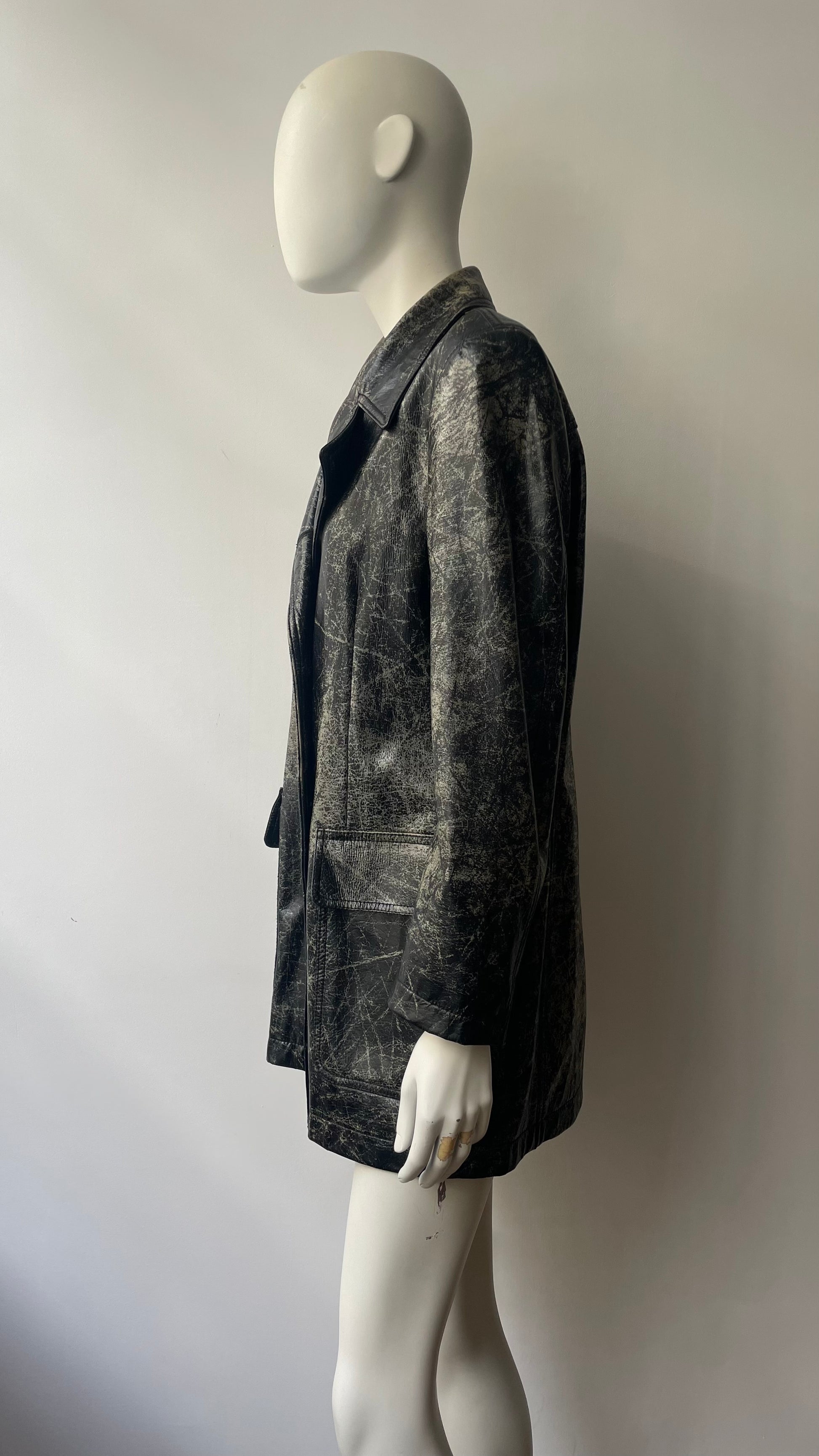 1990’s Yves Saint Laurent double breasted leather jacket in distressed / worn-out / ‘beaten up’ leather effect. Super rare vintage YSL piece, the worn-out leather effect gives avant-garde look that is quite unusual for the French design house. Features branded buttons. Unisex style. No size label, fits like ladies - size Large/ Extra Large, menswear- Medium/ Large. Measurements: